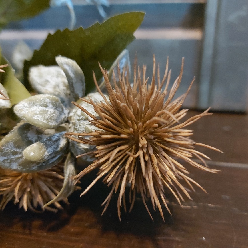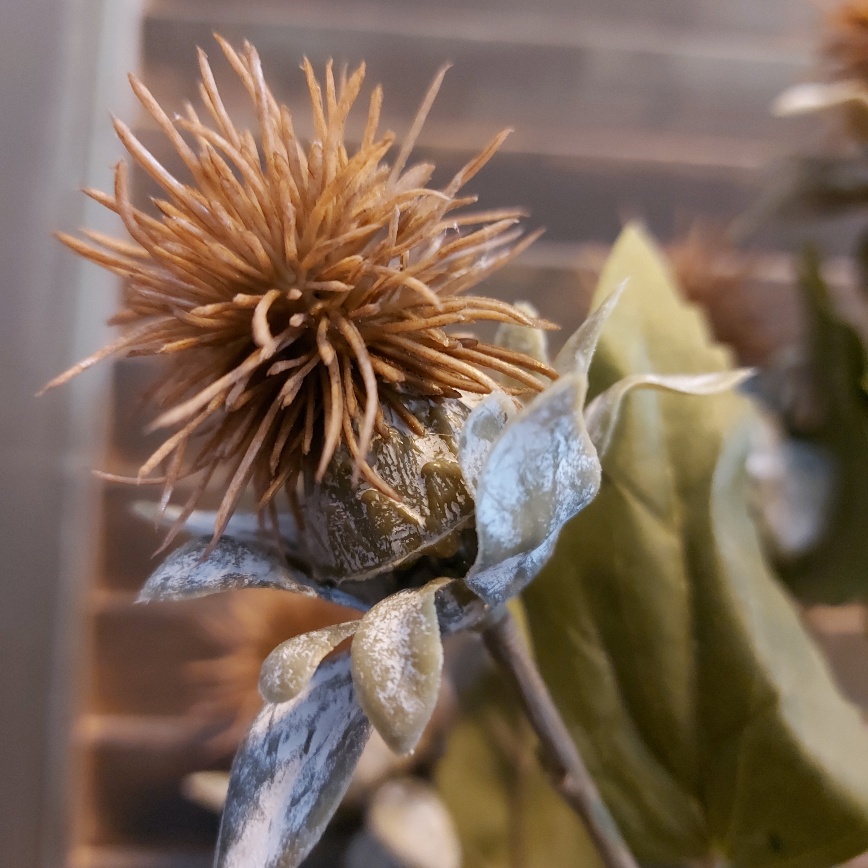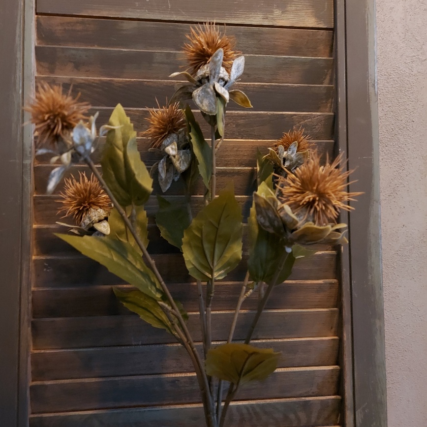 Zes grote bruine distels zitten er aan deze tak met kunstbloemen van Brynxz. Toegevoegd aan een mooi boeket maar ook als losse tak in een vaas is deze twijg met distels prachtig. De distel bloem zit in een grote knop en de tak is rijk gevuld met donkergroen blad.