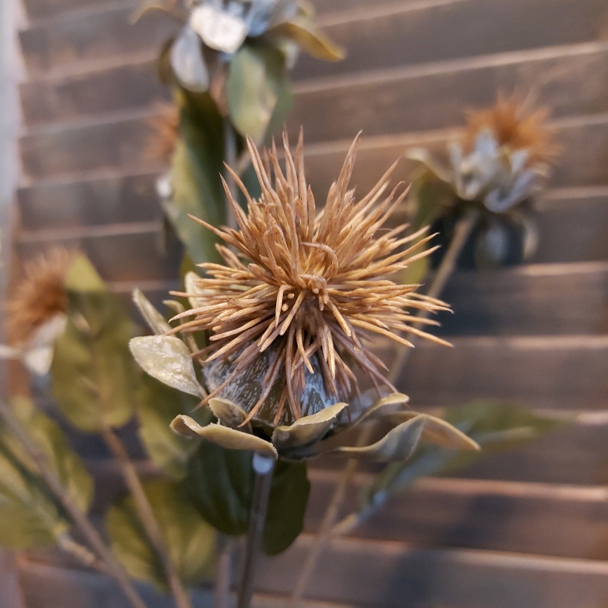 De twijg splitst zich op in zes zijtakken, elke tak is voorzien van een bloem. Combineren de Brynxz distel met andere kunstbloemen uit ons assortiment om je eigen persoonlijke boeket te creëren.