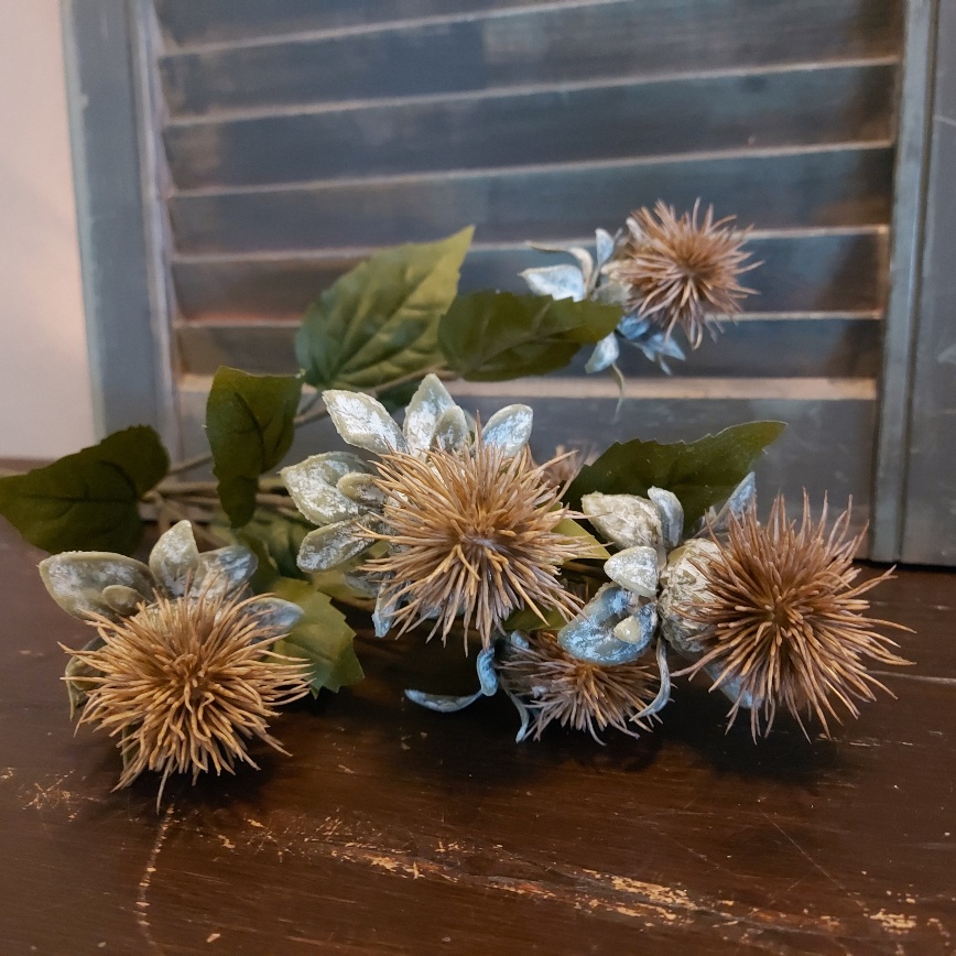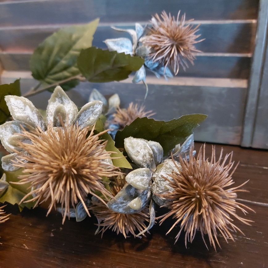 De Brynxz tak met distels is rijk gevuld met bloemen en blad. Voeg hem toe aan een boeket zijden bloemen of zet hem als enkele tak in een klein vaasje.