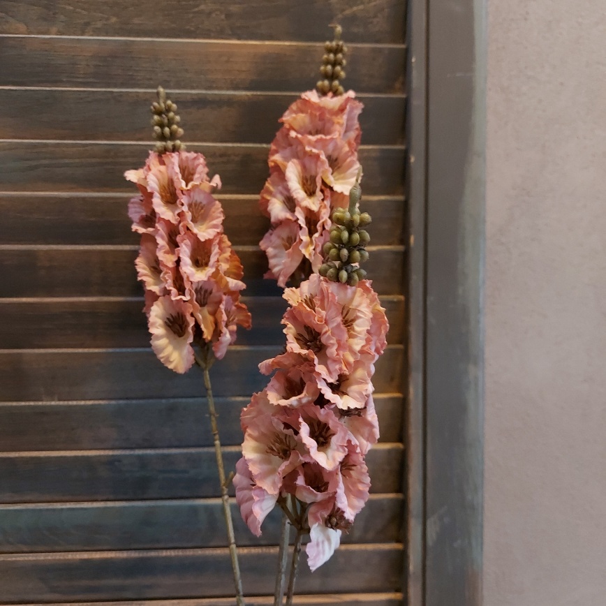 Flinterdunne en voorzien van een fijne structuur is de oudroze Brynxz Molucella zijdenbloem. Molucella is ook bekend als Klokken van Ierland of Ierse bellen. De tak splitst zich op in 3 zijtakken die elk voorzien zijn van een volle bloemstros.