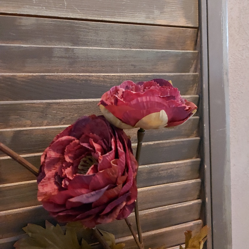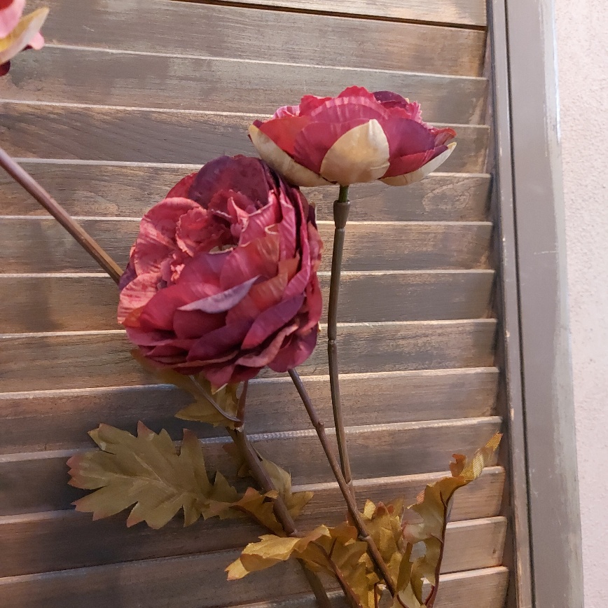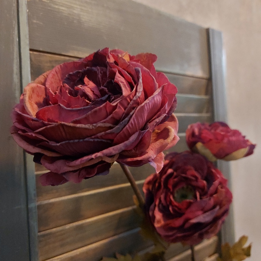De bordeauxrode bloemen van de Brynxz Ranonkel zijdenbloem zijn opgebouwd uit flinterdunne blaadjes. Aan de steel zitten drie bloemen in verschillend formaat.