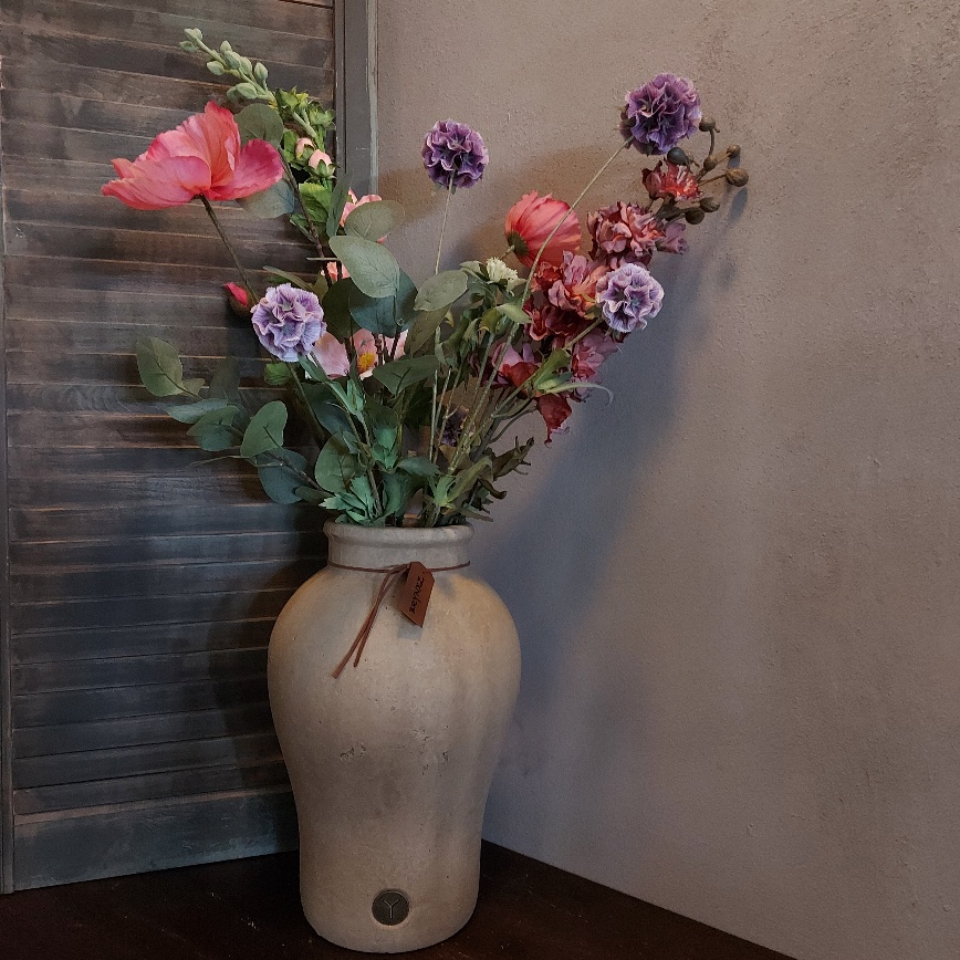 Omdat de Brynxz vaas Allure is gemaakt van aardewerk is deze niet geschikt om te vullen met water. In de webwinkel is een ruime collectie zijden bloemen verkrijgbaar om de bolvaas mee te vullen.