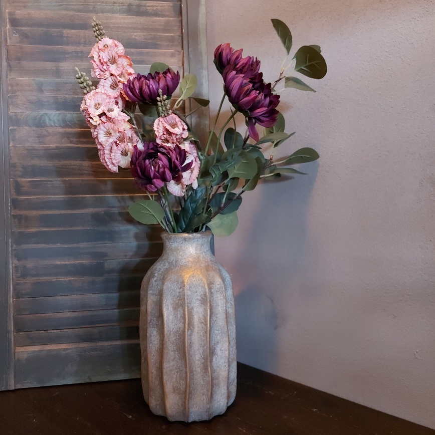 Een ruime collectie zijden en kunstbloemen om de vaas mee te vullen is ook bij ons verkrijgbaar. De vaas is gemaakt van aardewerk, hierdoor is hij niet geschikt om te vullen met water.
