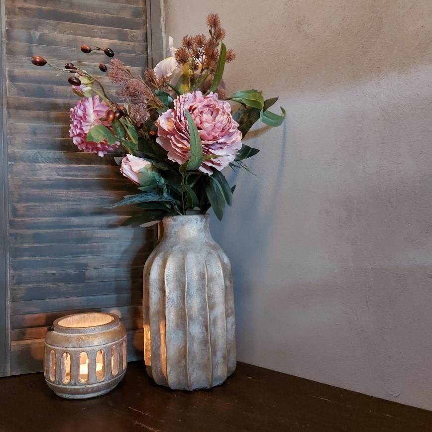 Een ruime collectie zijden en kunstbloemen om de vaas mee te vullen is ook bij ons verkrijgbaar. De vaas is gemaakt van aardewerk, hierdoor is hij niet geschikt om te vullen met water.
