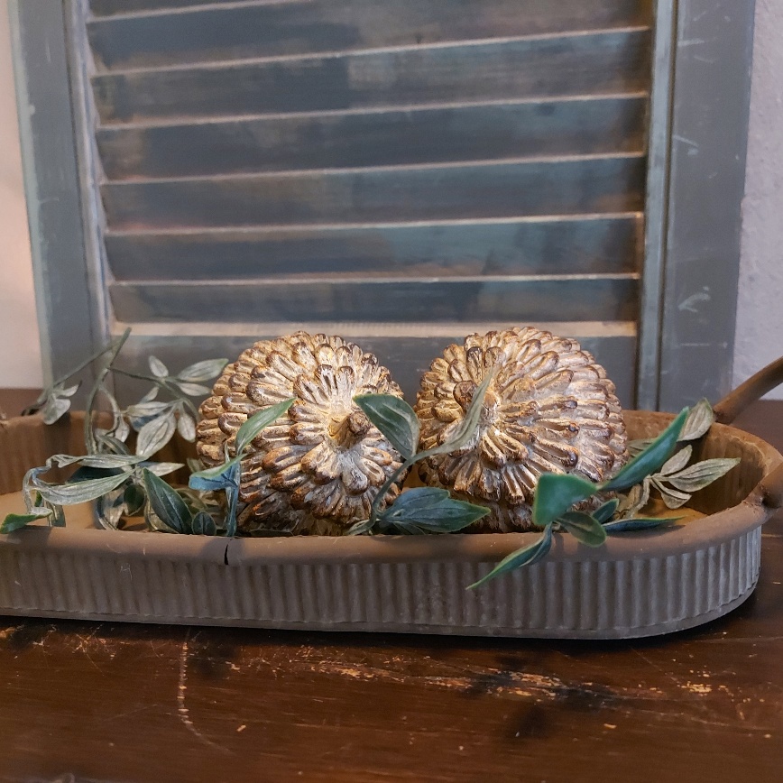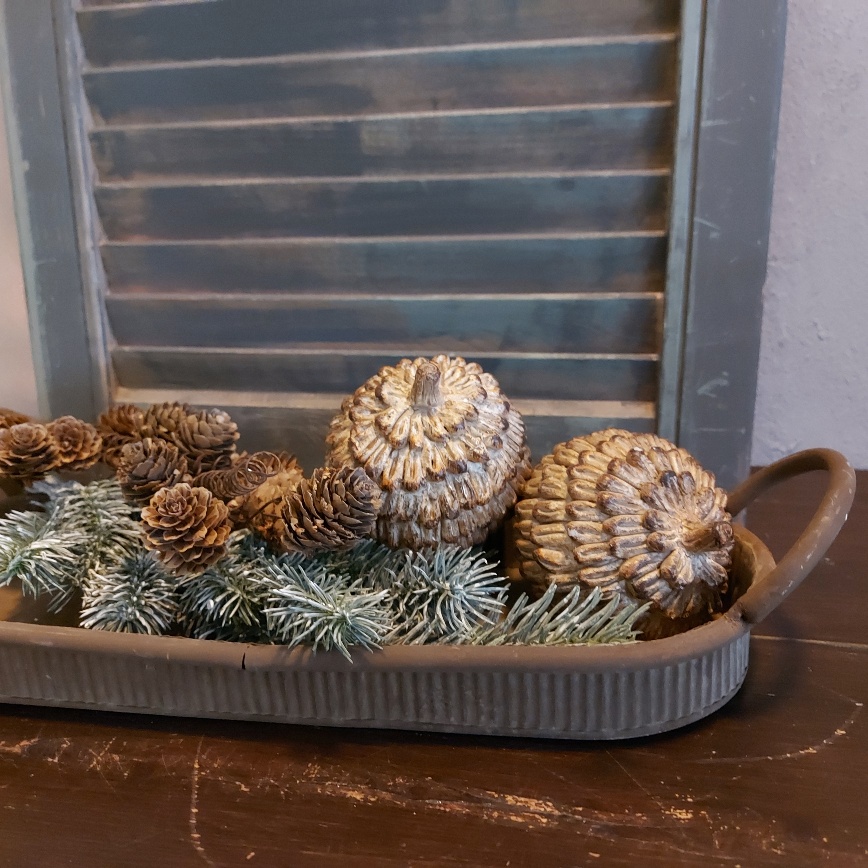 Leg één van twee dennenappels op een mooie schaal, takje groen is bij en klaar ben je. Een prachtige landelijke decoratie voor de herfst en de kerstperiode.