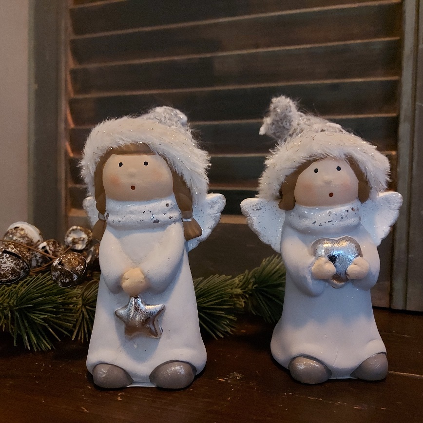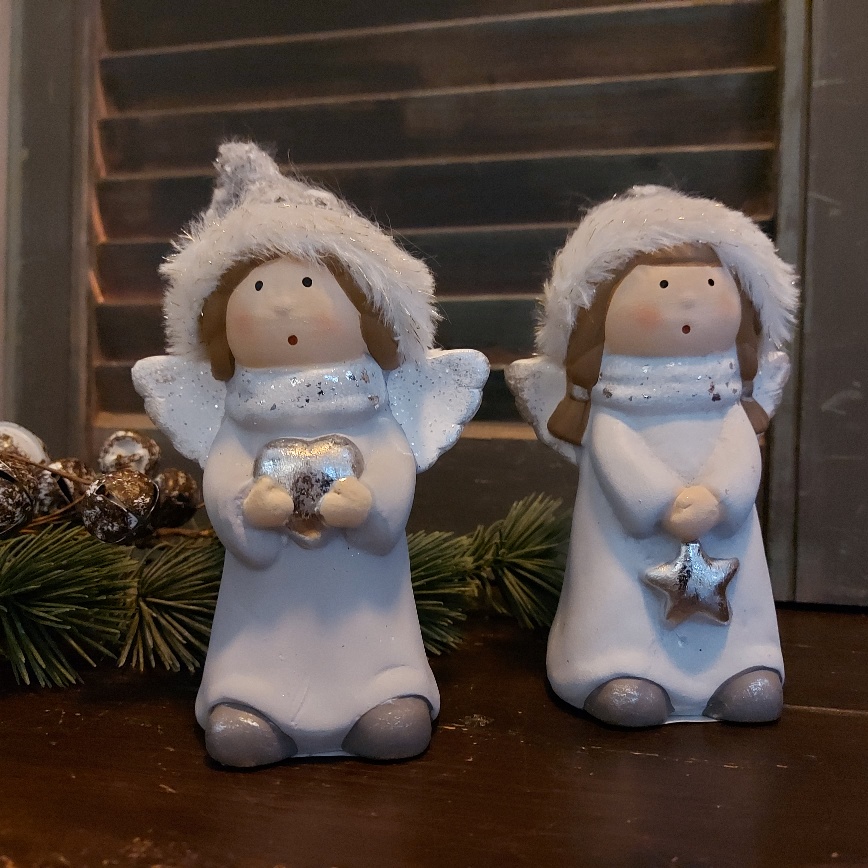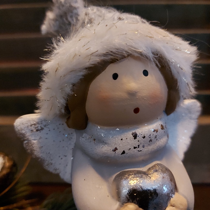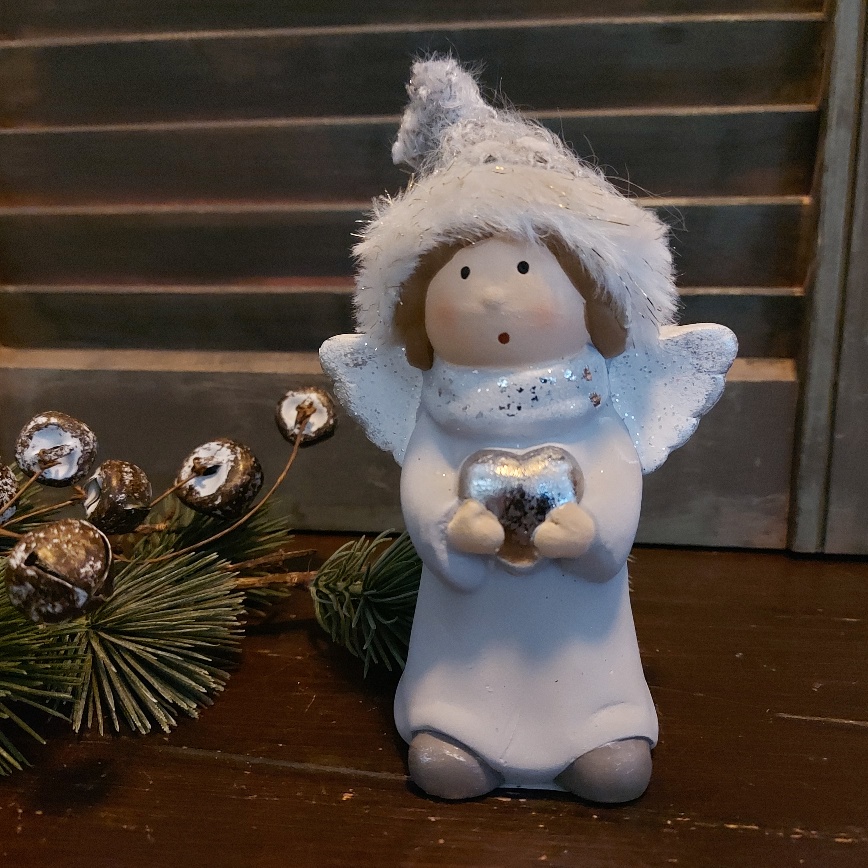 Wat een schatje, deze kerstengel van Countryfield. Ze heeft in haar handen een zilveren hartje en een warme gebreide muts op haar hoofd. Dit winterse beeldje is voorzien van fijne details.