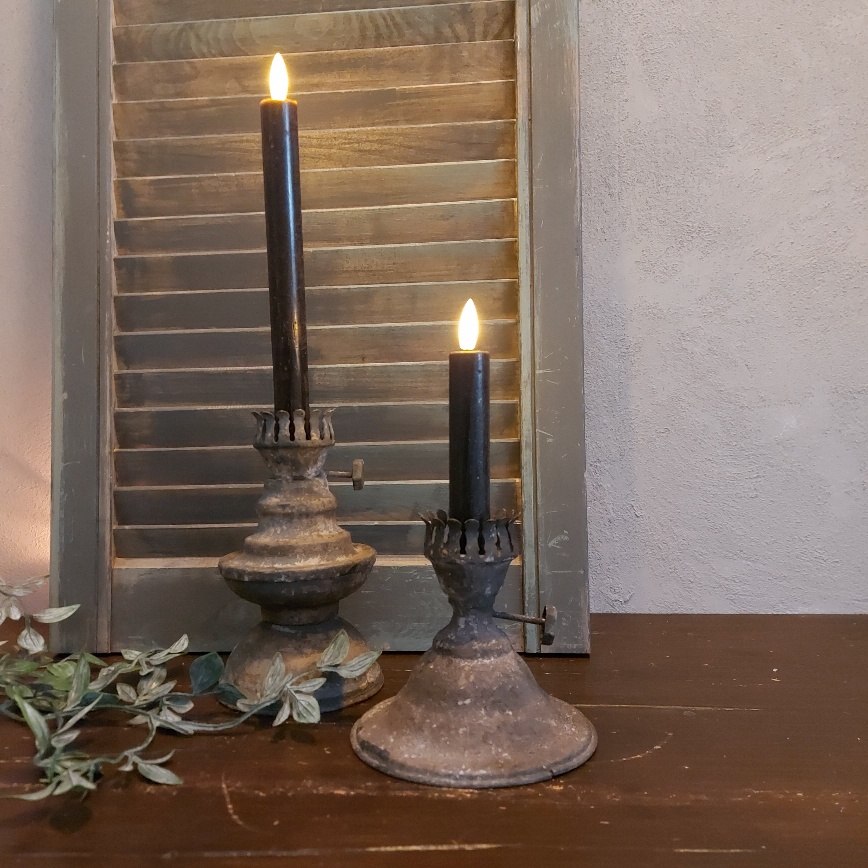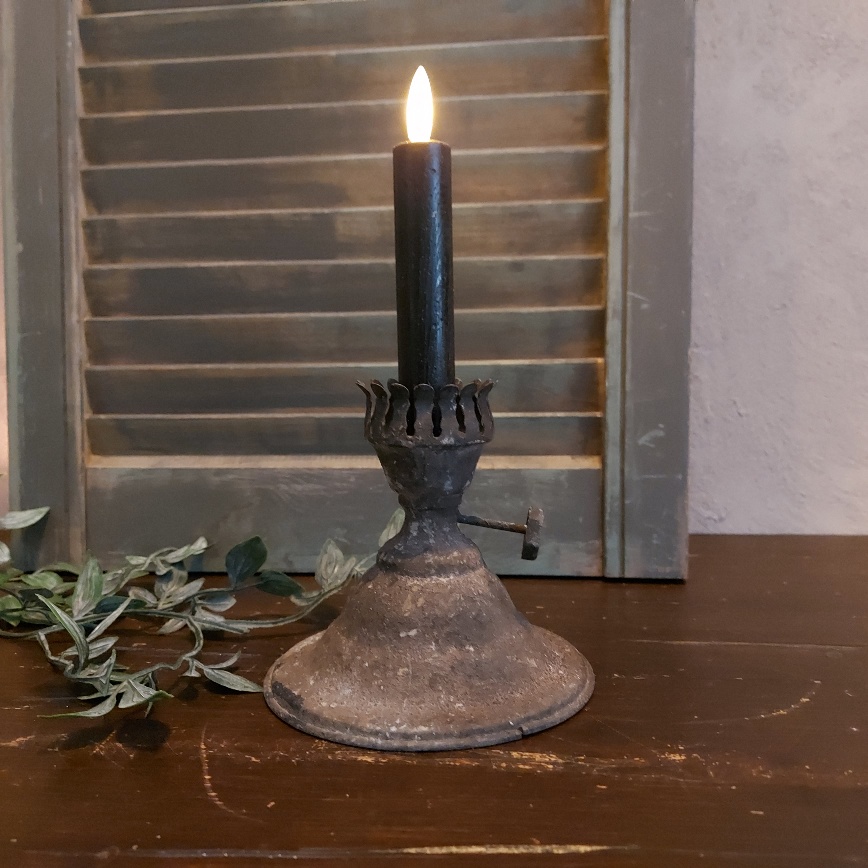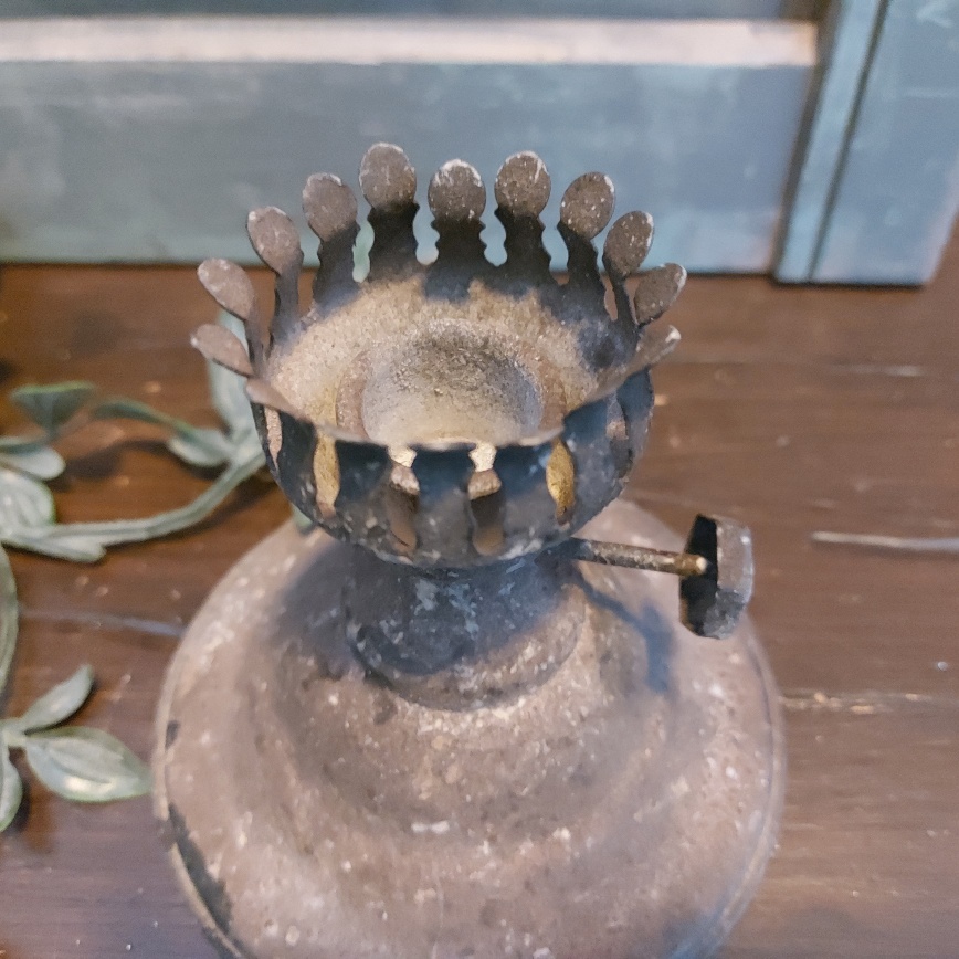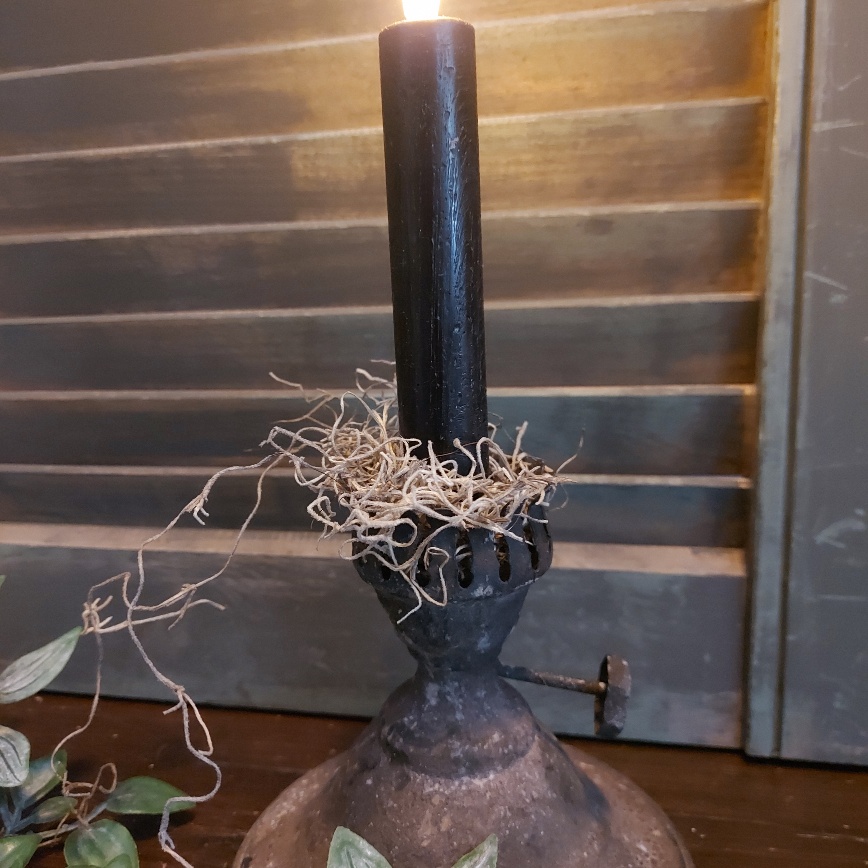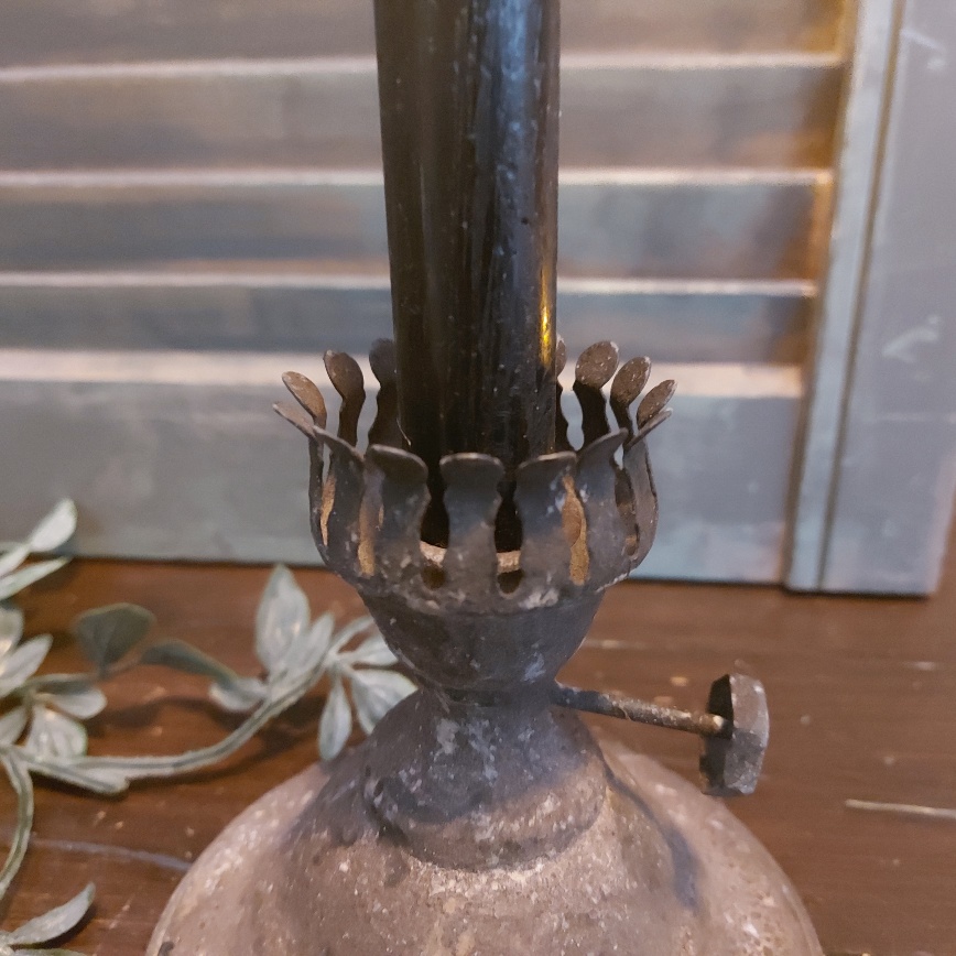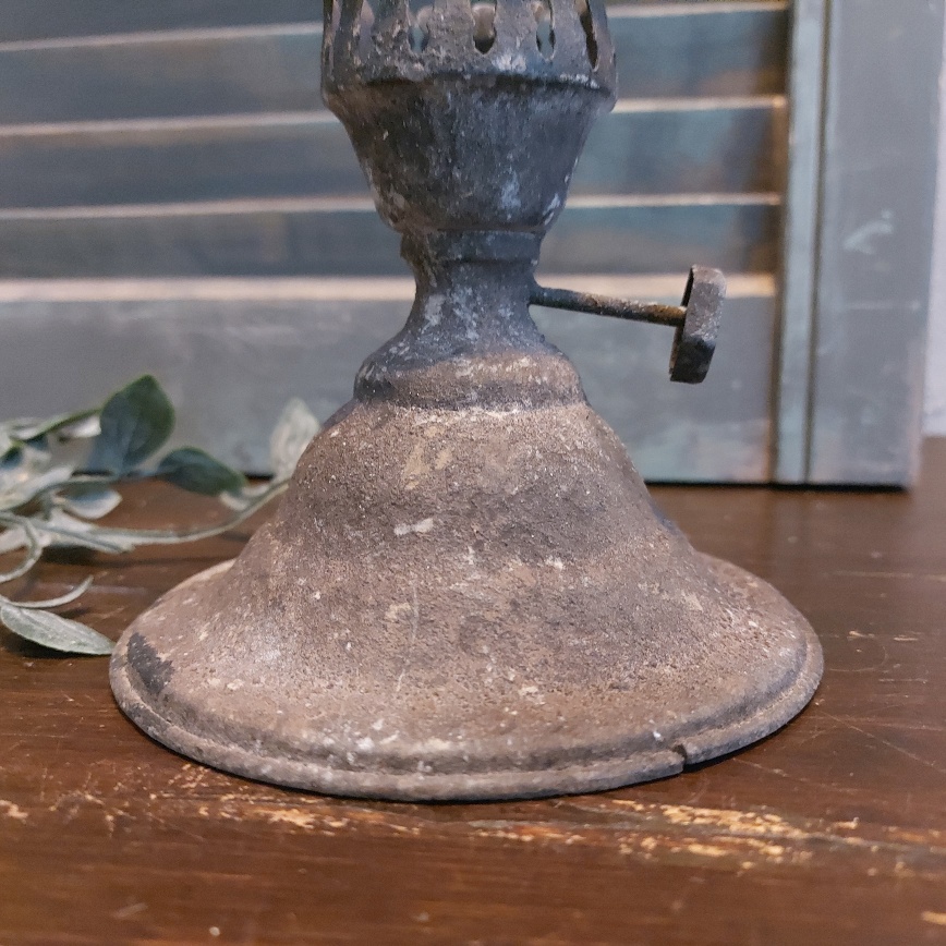 Deze kaarsenstandaard van Countryfield heeft het model van het onderstel van een ouderwetse olielamp. De roestige afwerking maken de brocante sfeer helemaal af.