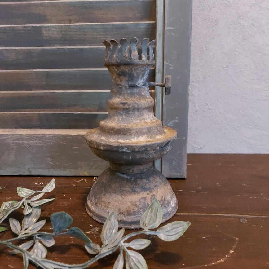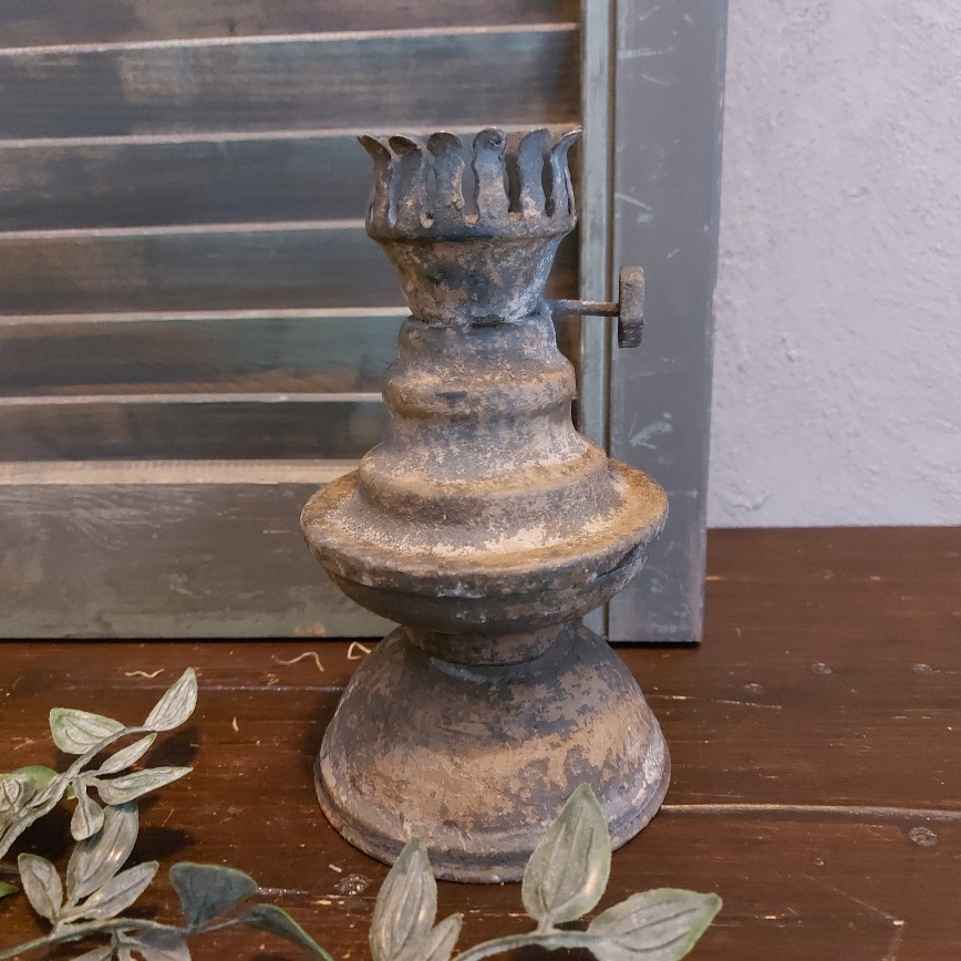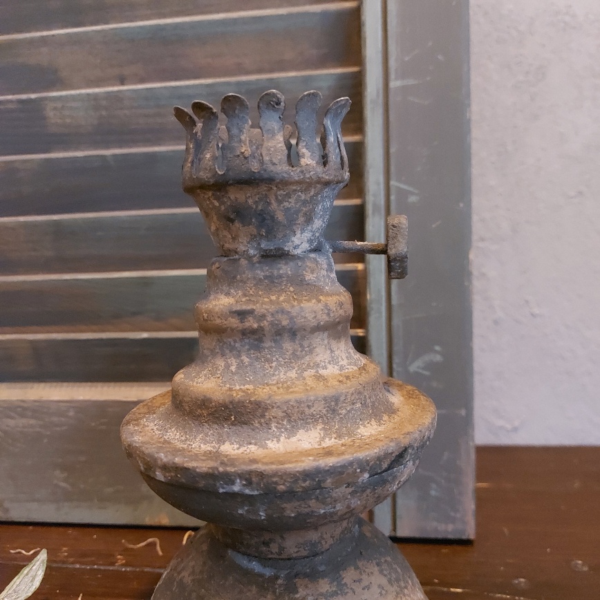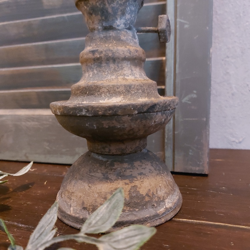 Deze kaarsenstandaard van Countryfield heeft het model van het onderstel van een ouderwetse olielamp. De roestige afwerking maken de brocante sfeer helemaal af.