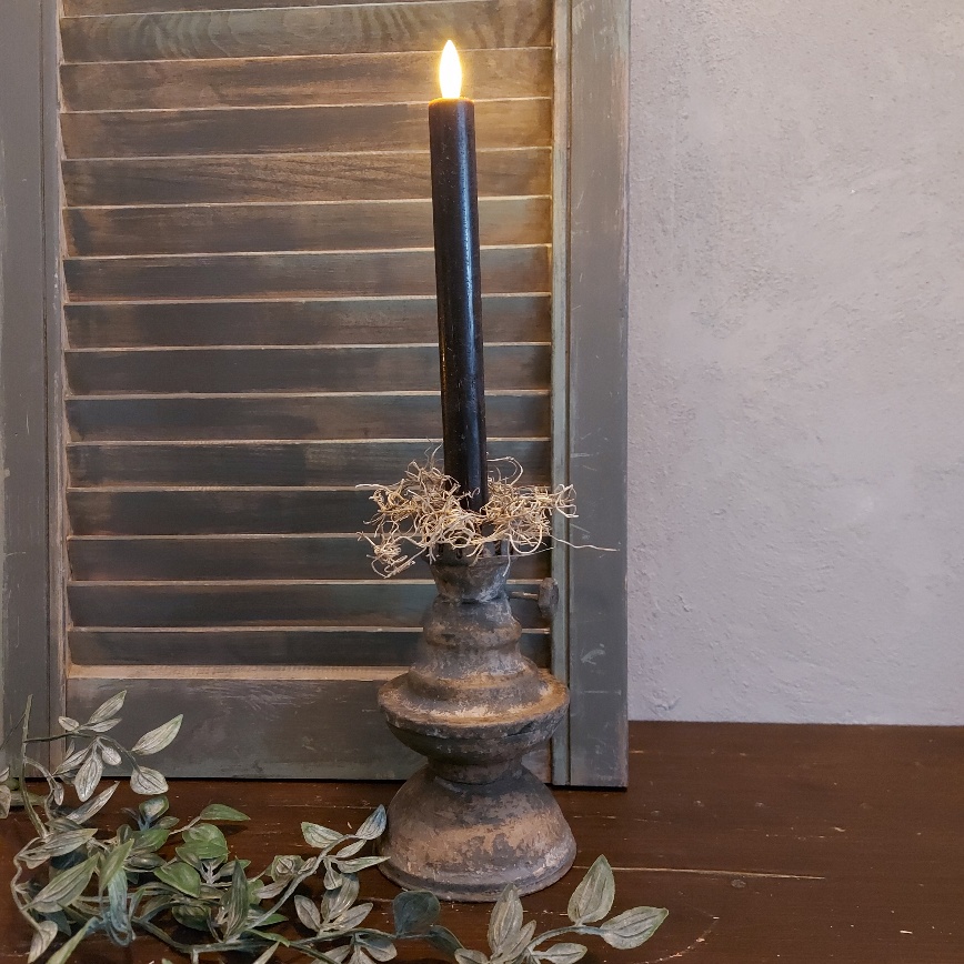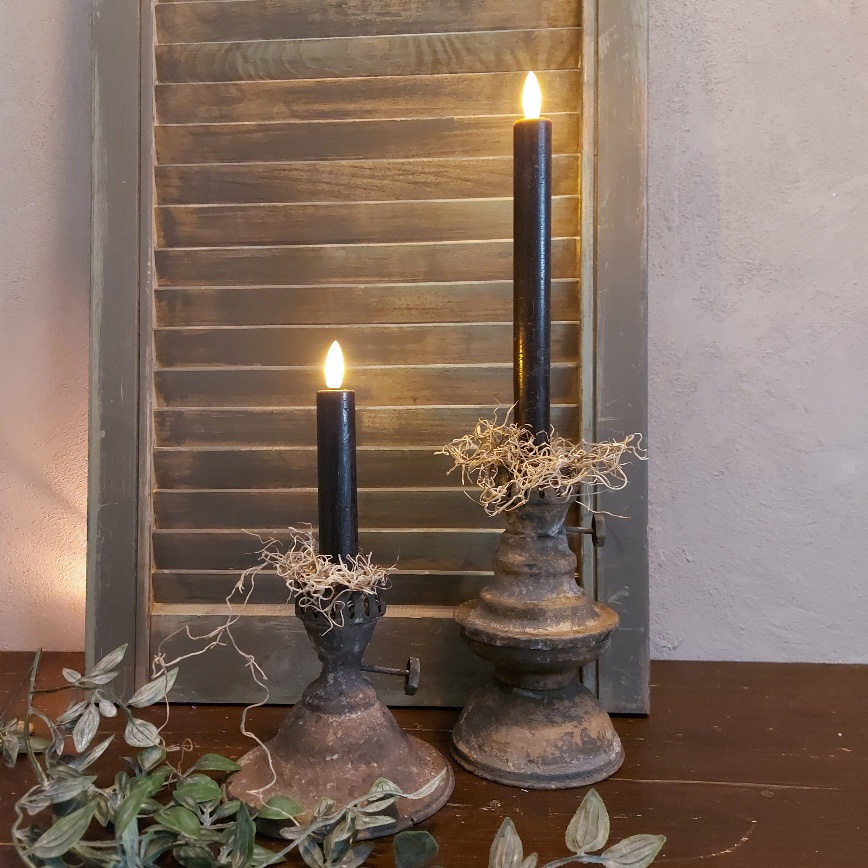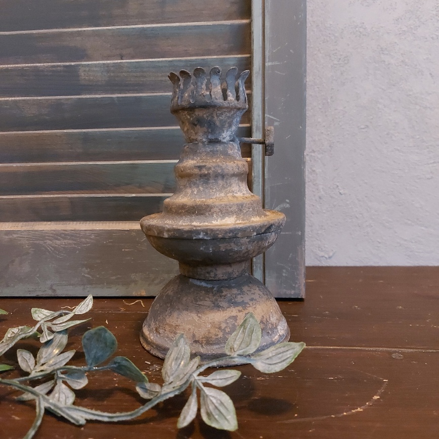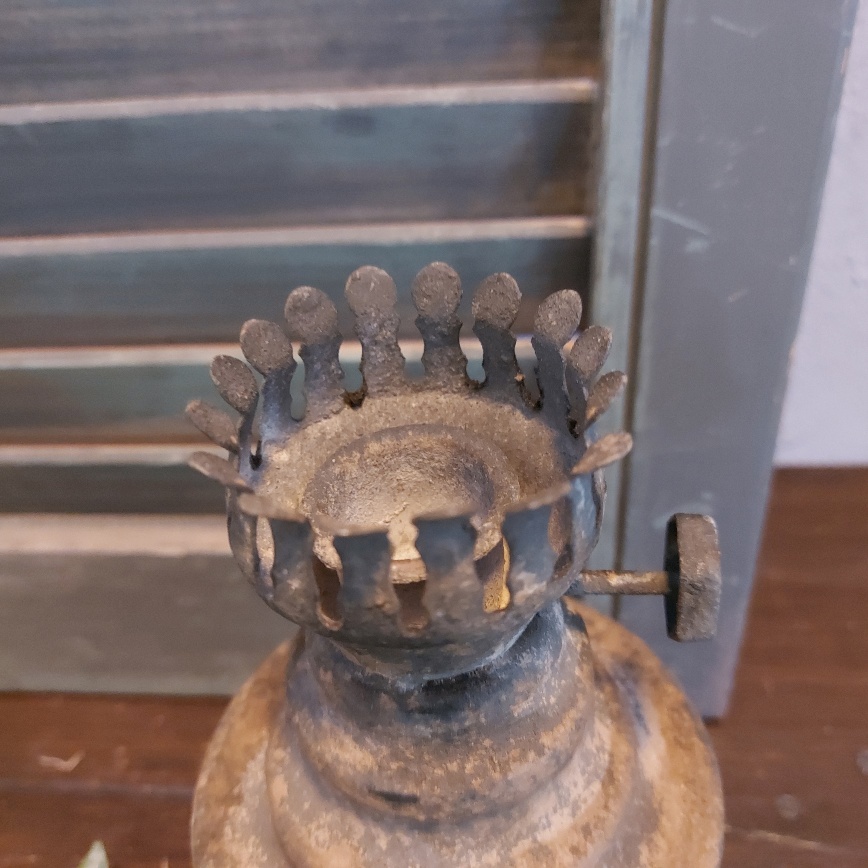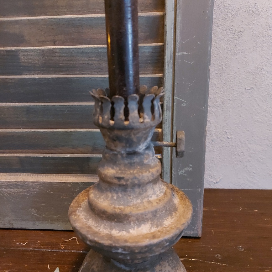 Deze kaarsenstandaard van Countryfield heeft het model van het onderstel van een ouderwetse olielamp. De roestige afwerking maken de brocante sfeer helemaal af.