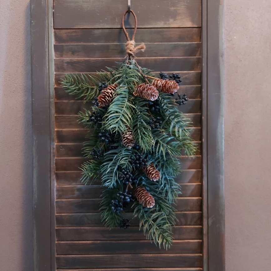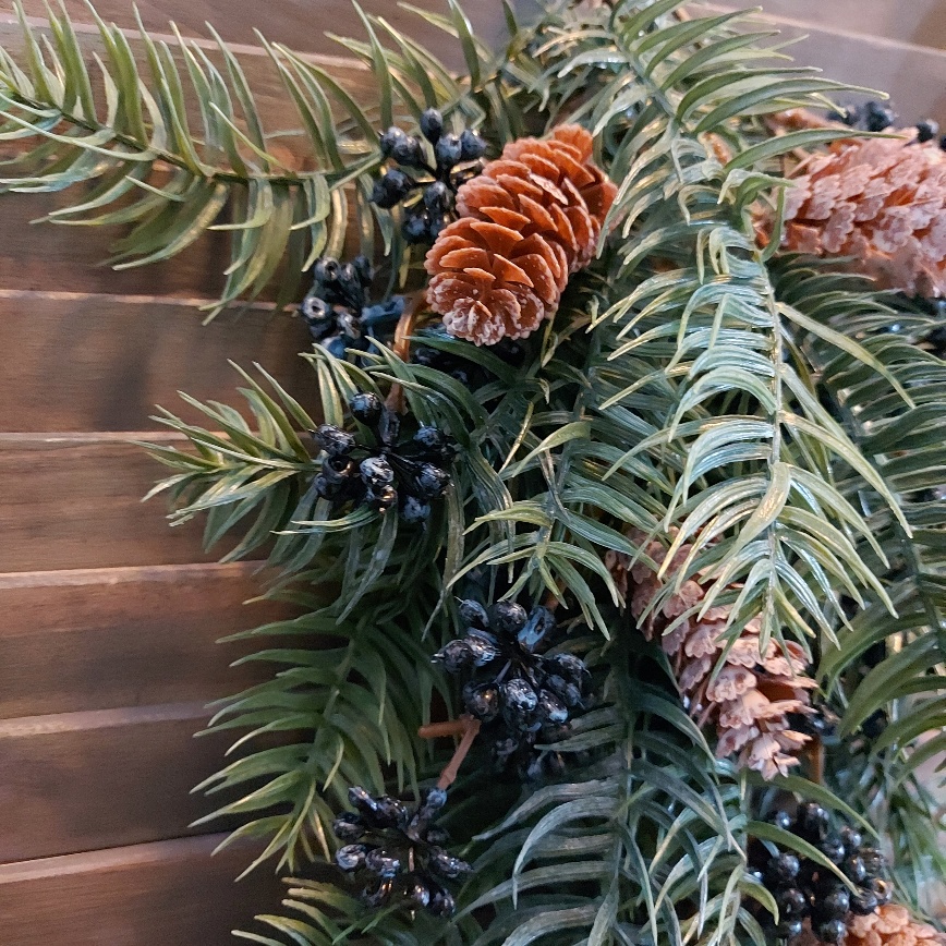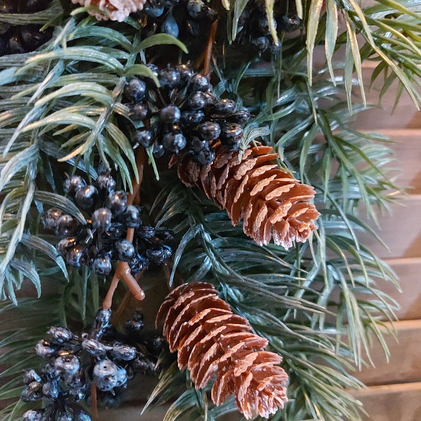 De Countryfield kersttoef is gemaakt van kunst dennentakken, daarnaast is de festoen opgevuld met onder andere bessen en dennenappels. Aan de bovenzijde wordt de toef bij elkaar gebonden met een jute touw. Dit vormt gelijk een handig ook om het kerststuk aan op te hangen.