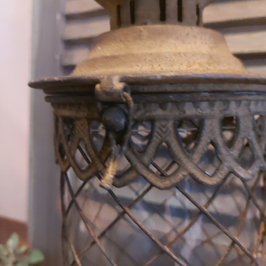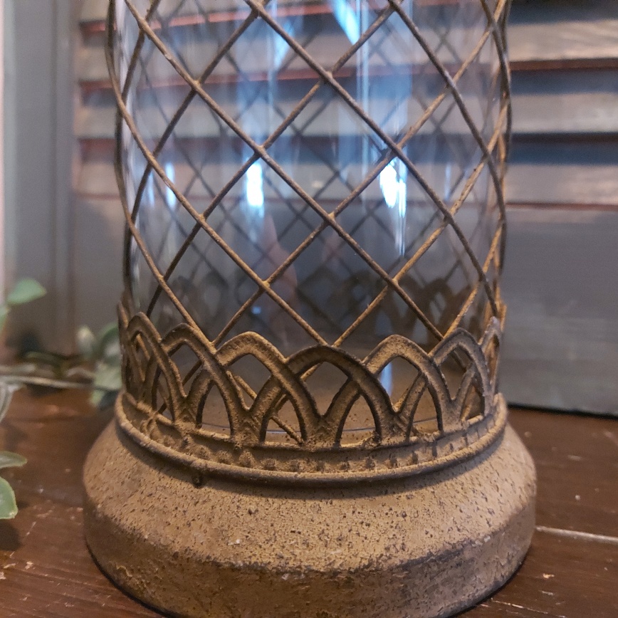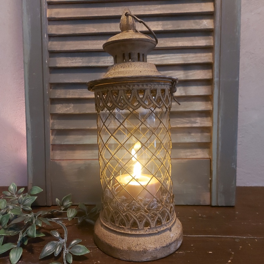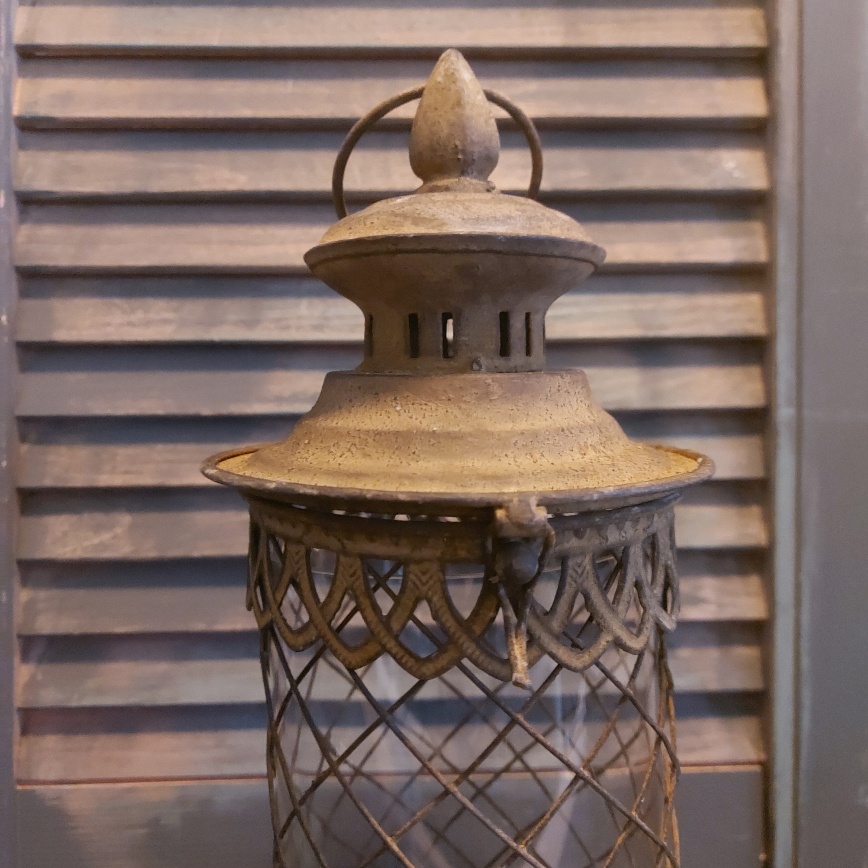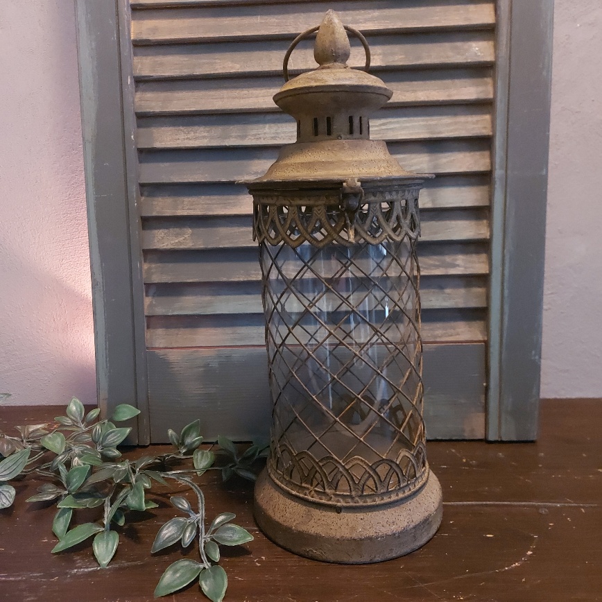 Kijk hoe sfeervol dit windlicht van metaal is. De lantaarn heeft allerlei bijzonder details en heeft een brocante uitstraling door het geroeste mataal.
