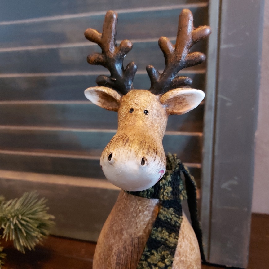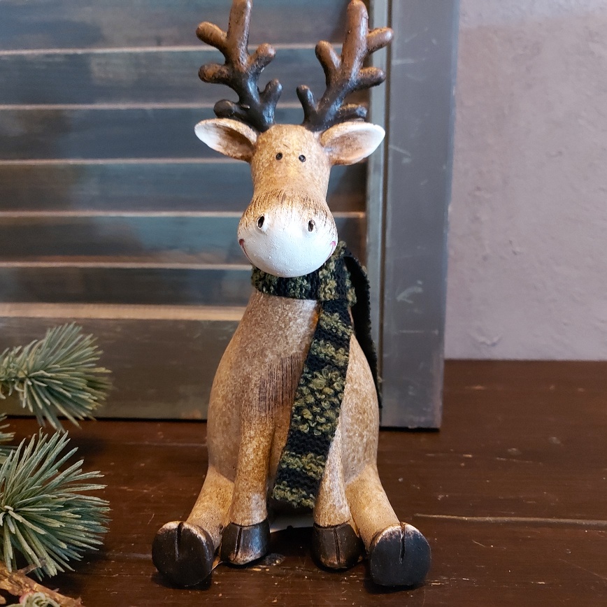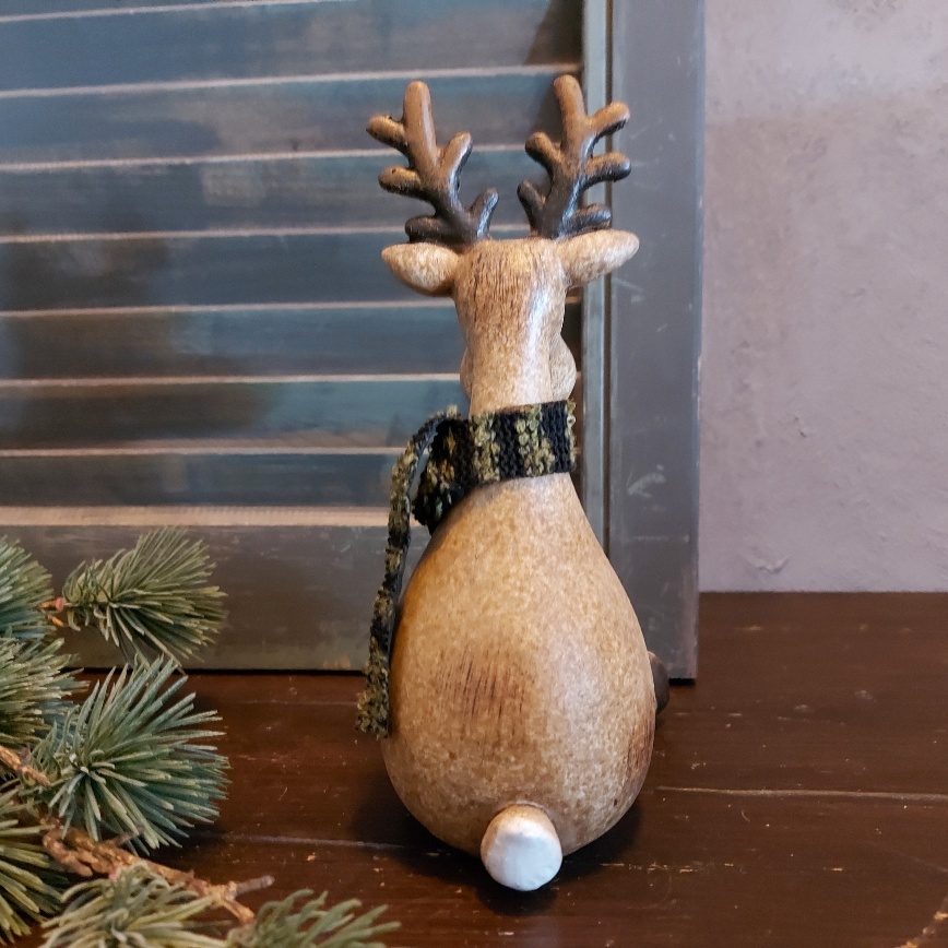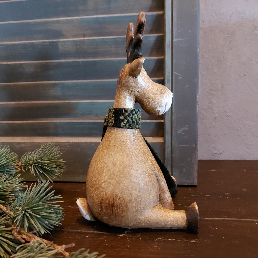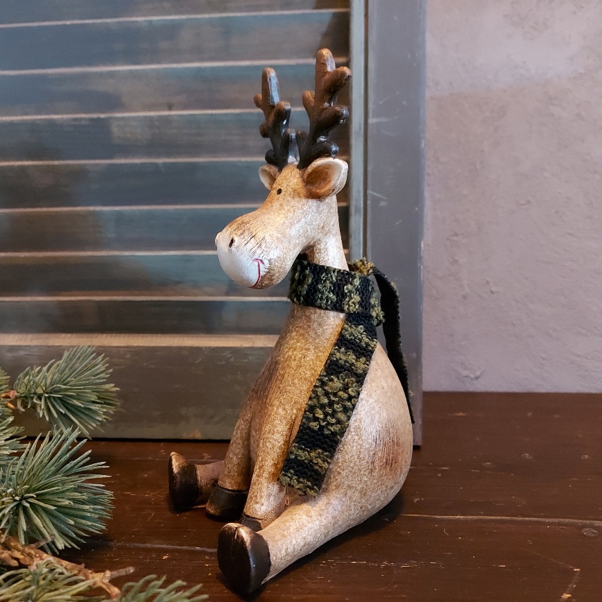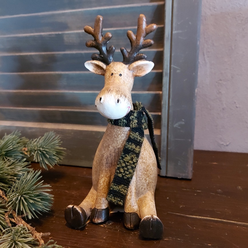 De bruine kraaloogjes van het Countryfield rendier Deavy kijken nieuwsgierig in het rond. Heerlijk ontspannen zit het Countryfield hert er bij. Om zijn hals hangt een warme sjaal van stof. Het rendier is rondom voorzien van fijne details en een geweldig leuke decoratie voor de kerst.