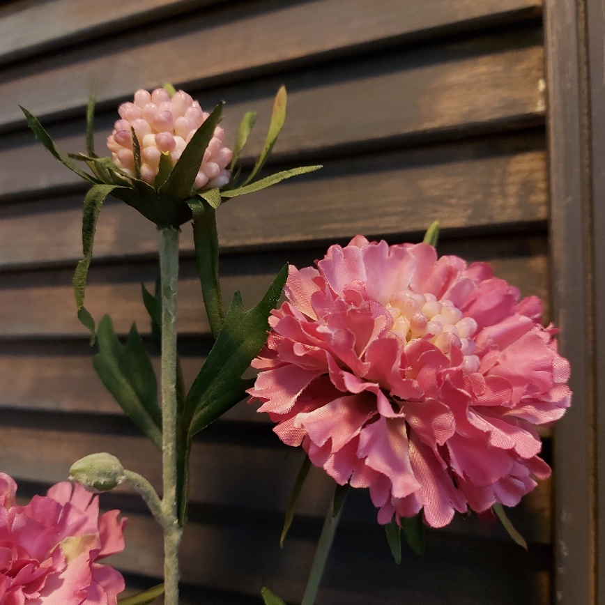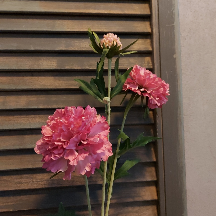 De bloemen van de Countryfield Scabiosa zijdenbloem zijn opgebouwd uit tientallen flinterdunne blaadjes. Er zitten drie roze bloemen aan de steel in verschillende stadia van bloei. Scabiosa is ook wel bekend onder de naam Duifkruid.