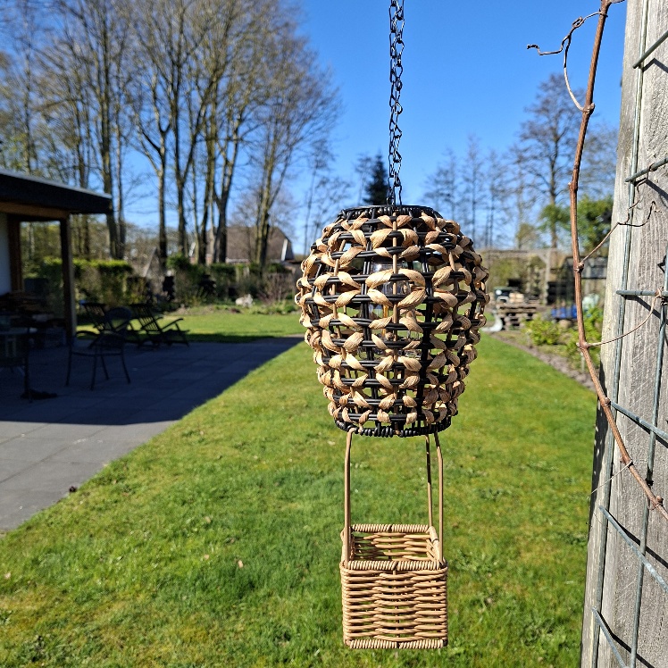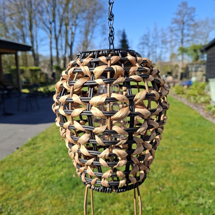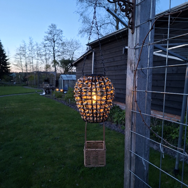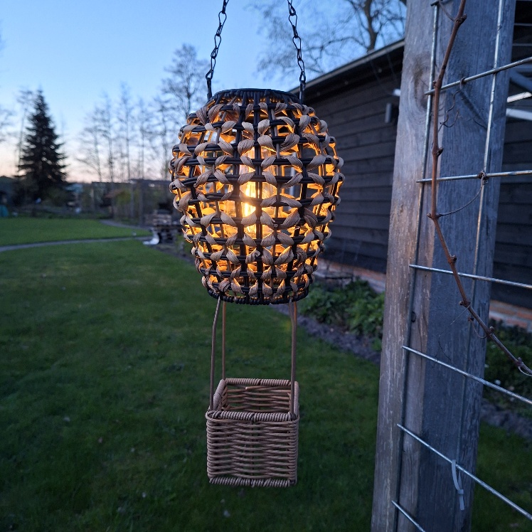 Sfeervolle avonden in de tuin heb je heel gemakkelijk deze Countryfield Solarlamp in het model van een luchtballon. De Solarlamp luchtballon heeft een frame van zwart metaal en is afgewerkt met ratan. Je kan de Solar buitenlamp wegzetten en eenvoudig ophangen aan de ketting die voorzien is van een haak. Mooi op de tuintafel, leuk in de pergola, sfeervol aan de tak van een boom.