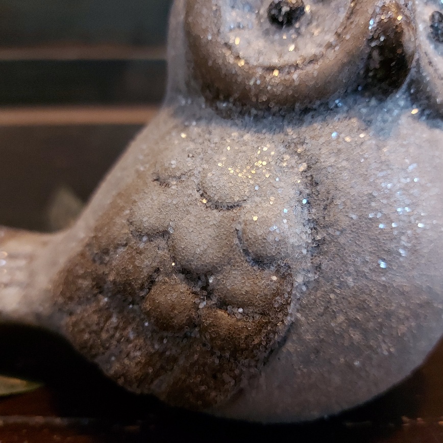 Rondom is het beeldje van de uil voorzien van fijne details. Langs alle zijden is hij mooi om te zien. Dit maakt deze decoratie erg geschikt om te verwerken op een mooie schaal.