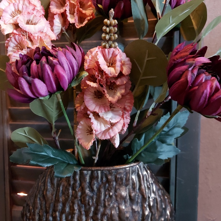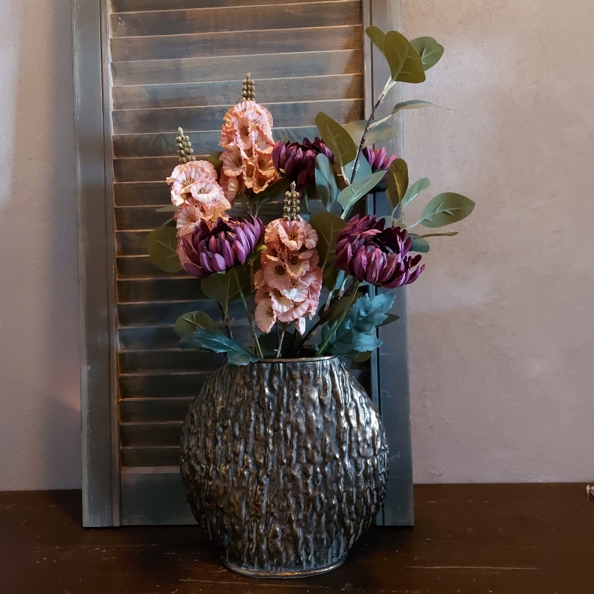 Mooie kunstbloemen en -planten om in de vaas te plaatsen zijn ook verkrijgbaar in de webwinkel. Omdat de vaas is gemaakt van metaal is deze niet geschikt om te vullen met water.