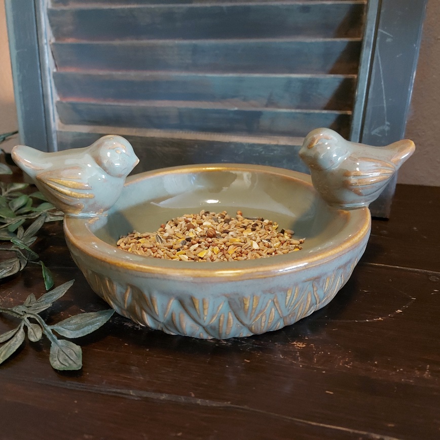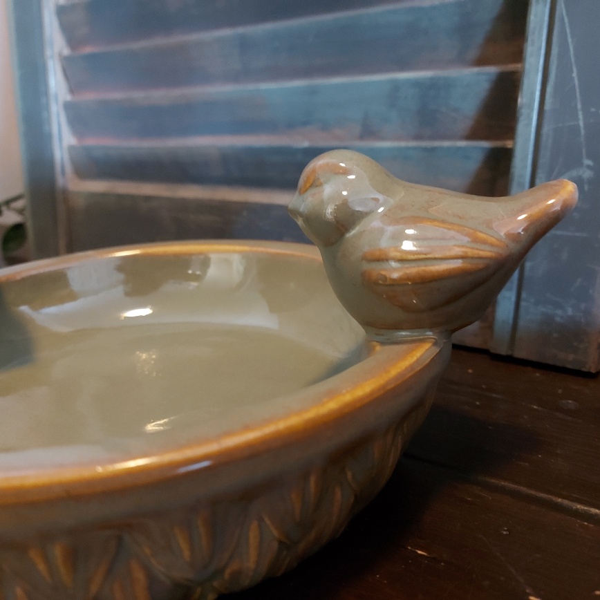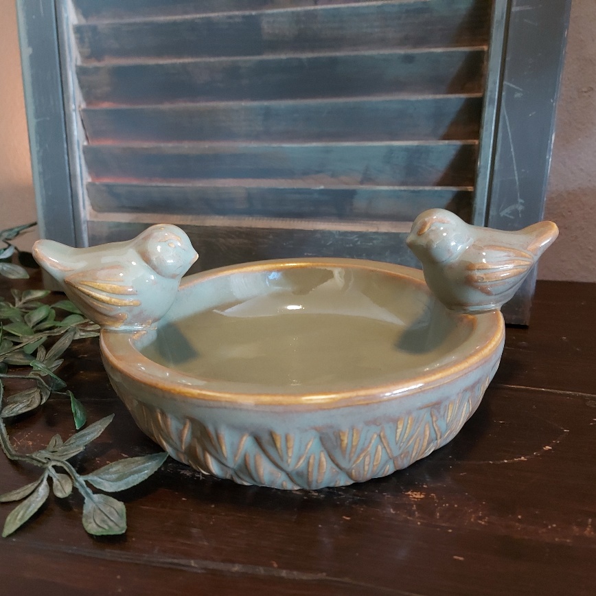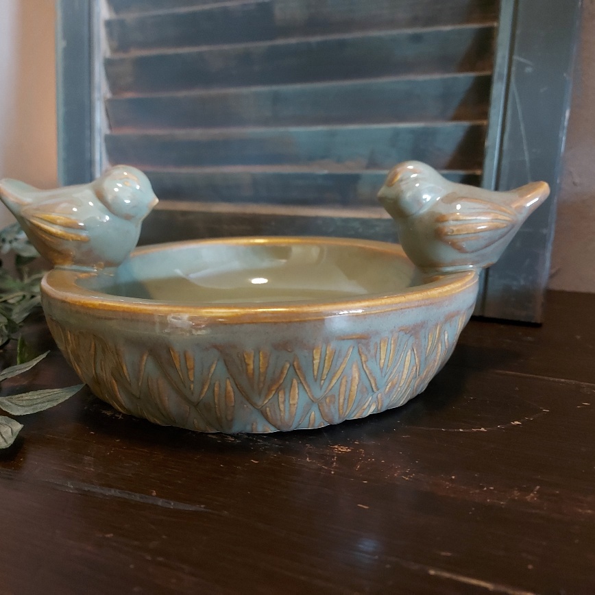 De schaal is gemaakt van aardewerk en heeft een prachtige olijfkleurige glazuurlaag. Op het randje van de voederschaal zitten twee vogeltjes.