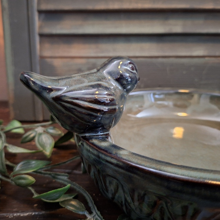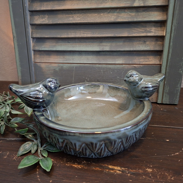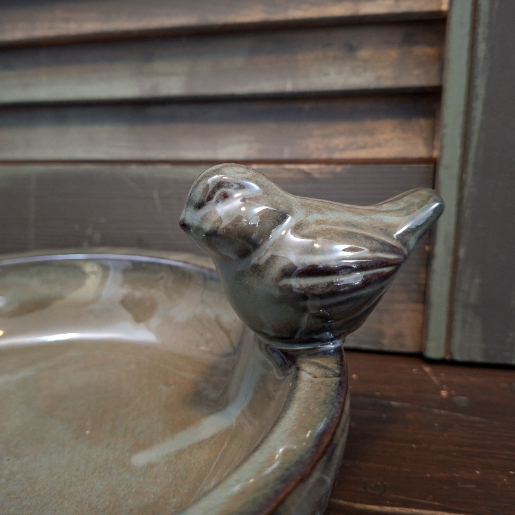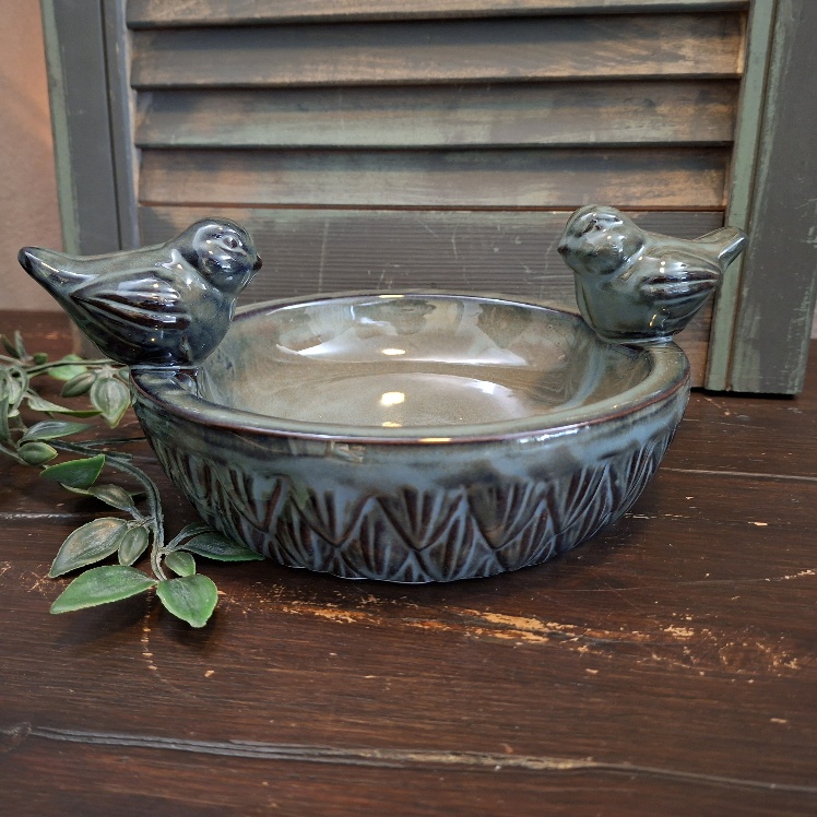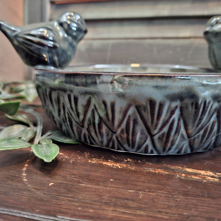 De schaal is gemaakt van aardewerk en heeft een prachtige blauwe glazuurlaag. Op het randje van de voederschaal zitten twee vogeltjes.