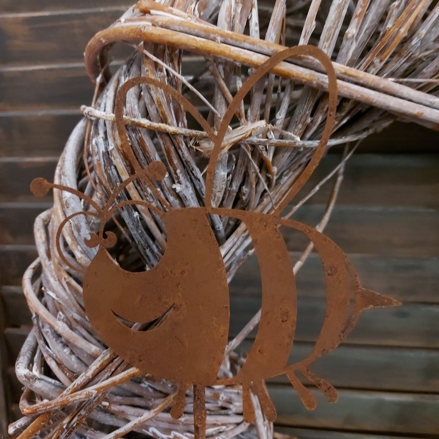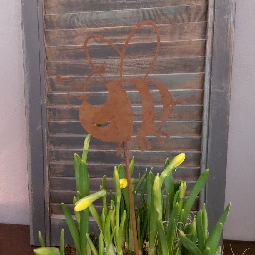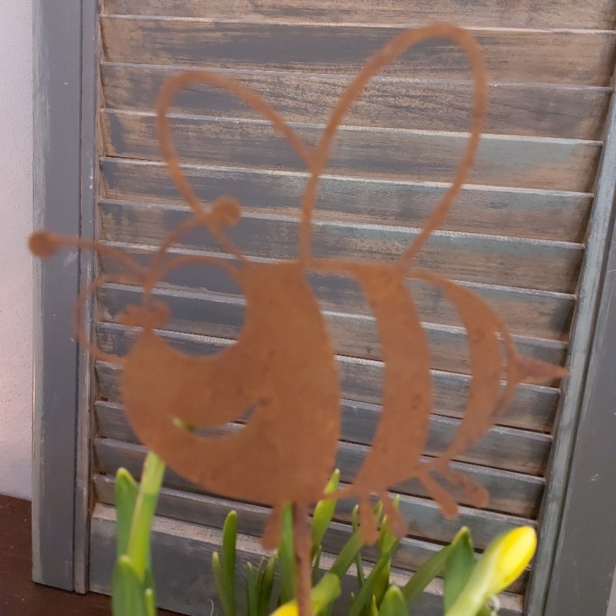 Vrolijk je bloempot op met deze bij van cortenstaal.