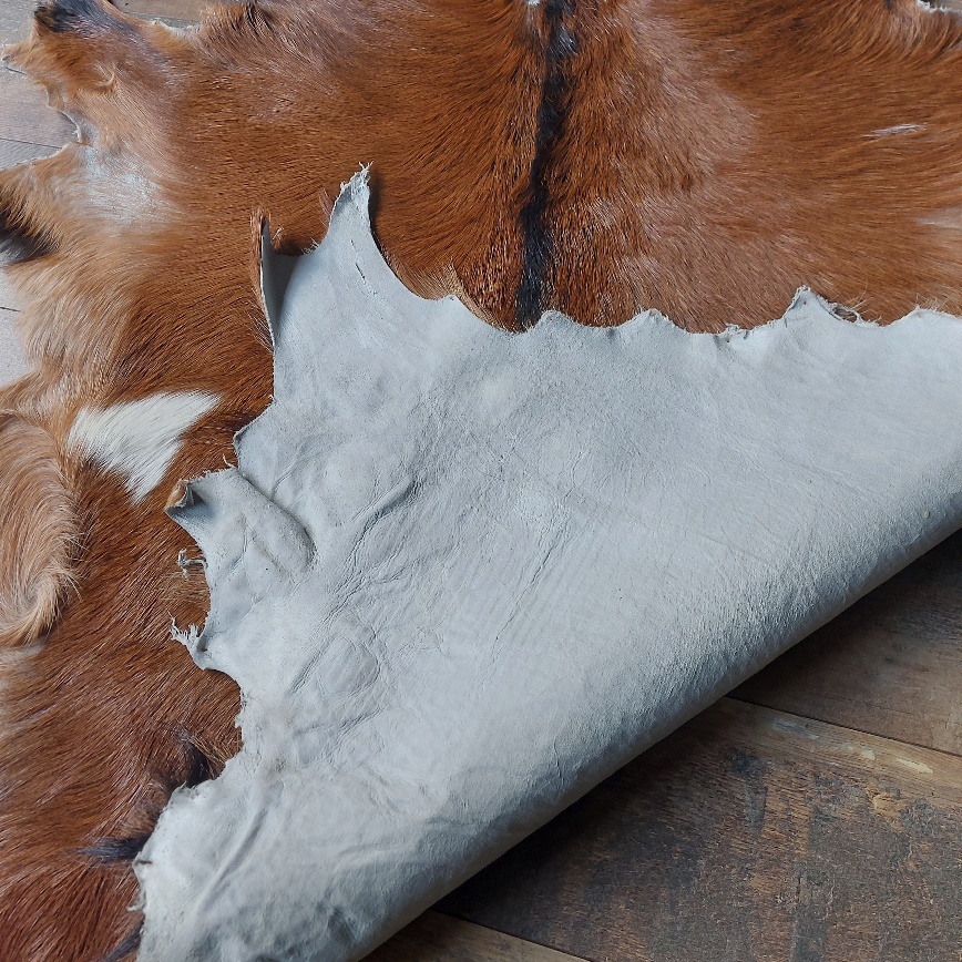 De onderzijde van het decoratieve geitenvacht is van soepel leer en de bovenzijde is van zijdezacht geitenhaar. De afmeting van het vacht is ongeveer 97 x 80 cm.