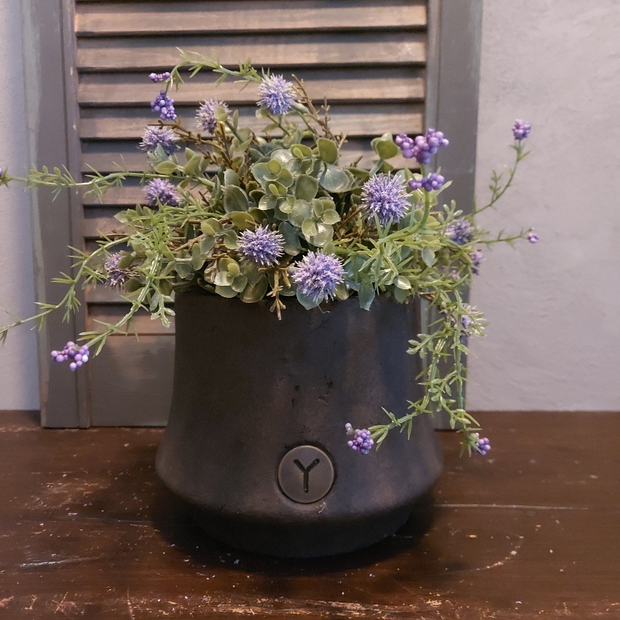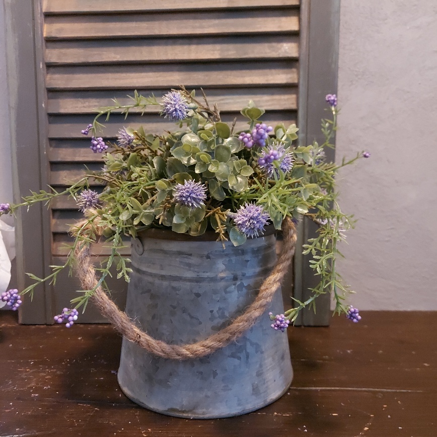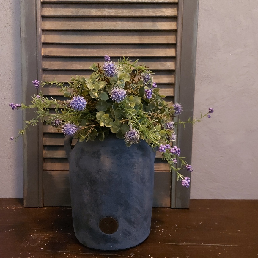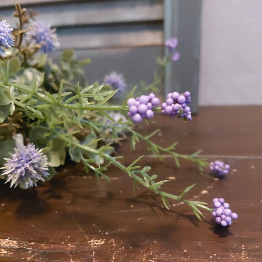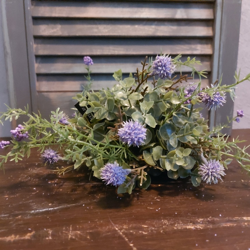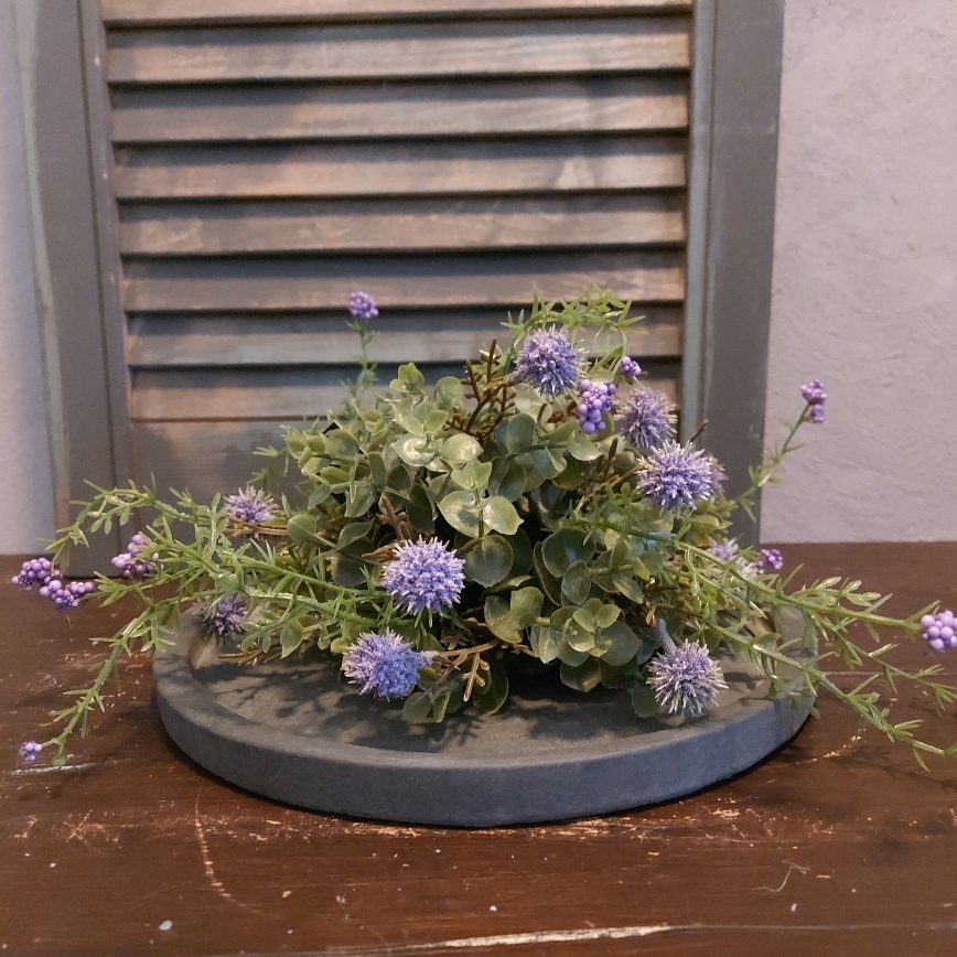 Een schaal, een pot, een poer, een kandelaar, je kan deze halve bol met kunstbloemen werkelijk overal op leggen. De paarse distels combineren perfect met het groen van de eucalyptus.