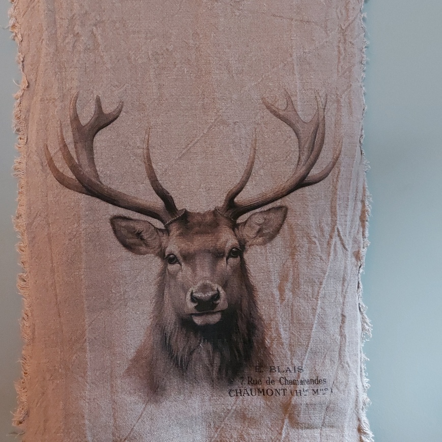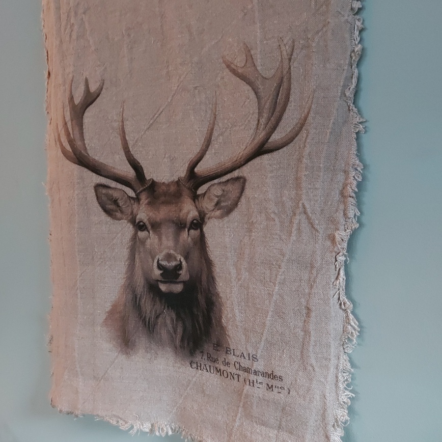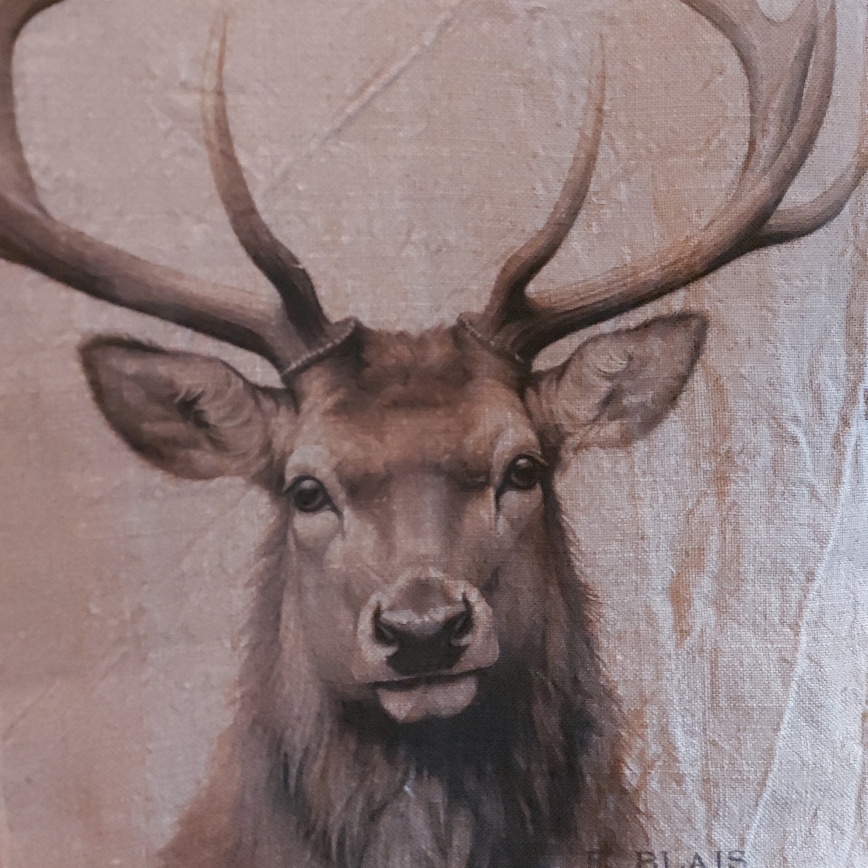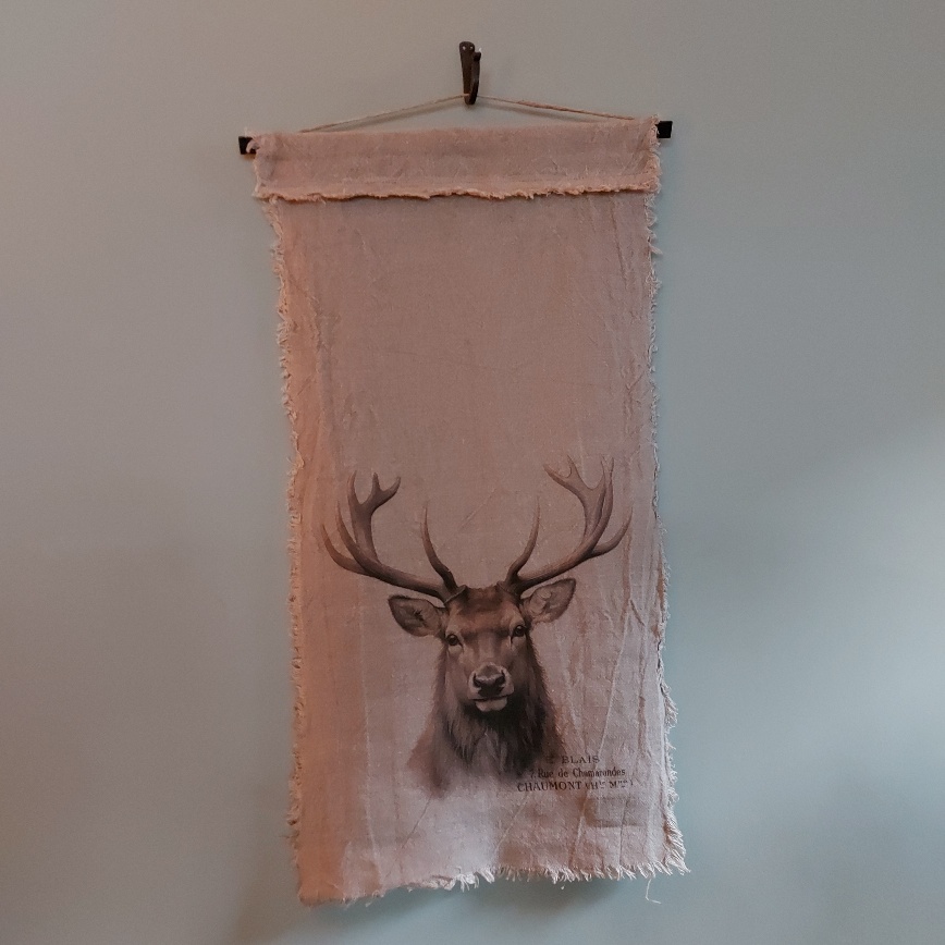 Op dit prachtige wanddoek staat een hert met gewei afgebeeld. De afbeelding van het hert is op het shabby wandkleed gedrukt in sepia tinten. Het Hert shabby wanddoek heeft een mooie doorleefde uitstraling en is niet voorzien van een zoom. Dit zorgt voor een mooi rafelig effect. De doeken zijn gemaakt van 100% grof shabby naturel kleurig linnen.