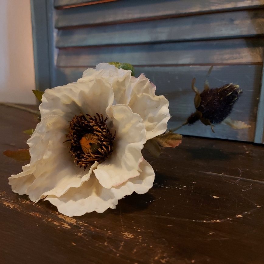 Flinterdun zijn de blaadjes van deze crème kleurige klaproos van Countryfield. De sierlijke tak is voorzien van een grote bloeiende Papaver en een bloem in knop. Een klaproos is perfect om toe te voegen aan een veldboeket.