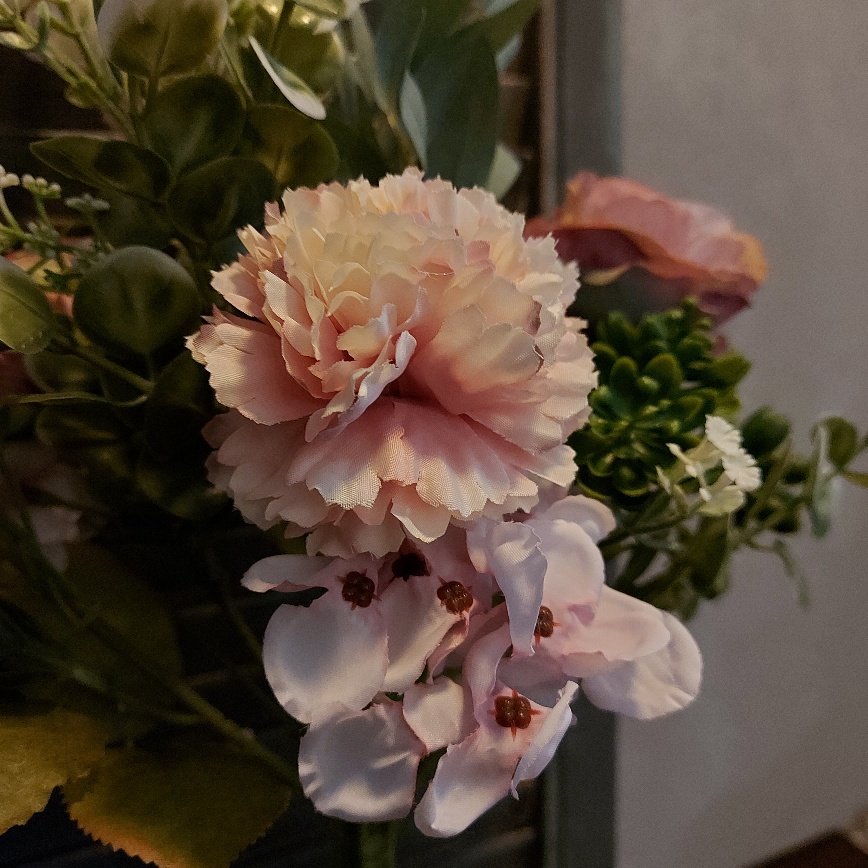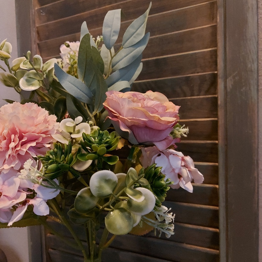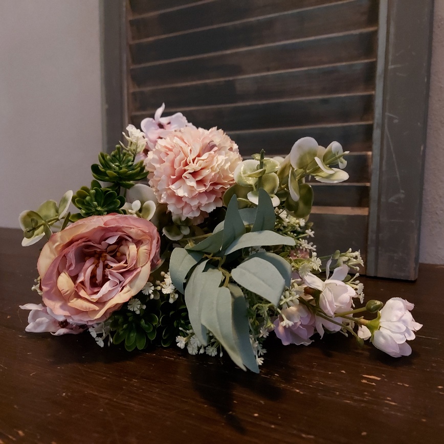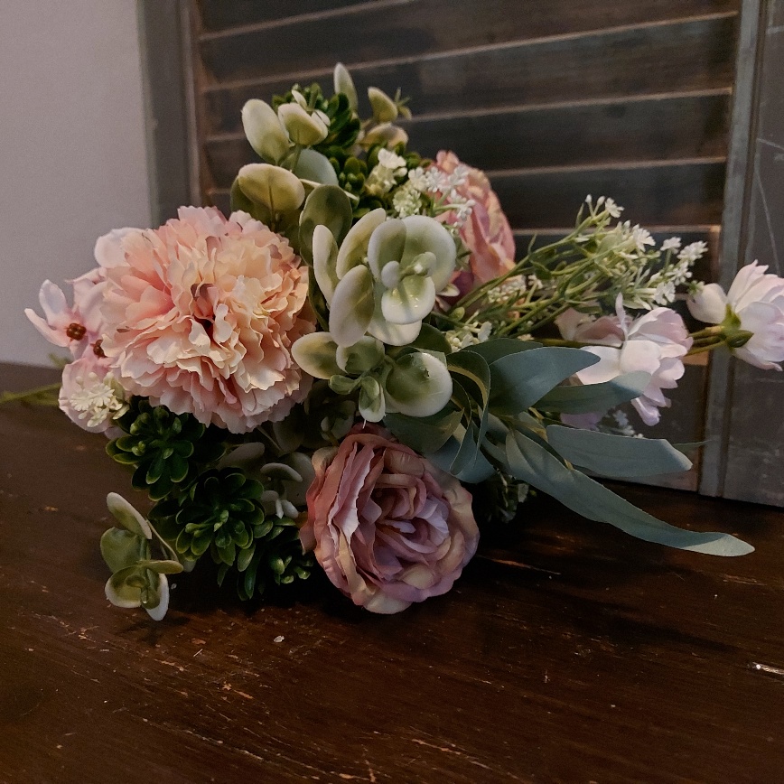 Het kunstbloemen boeket bevat onder andere pioenrozen, eucalyptus en hortensia’s.