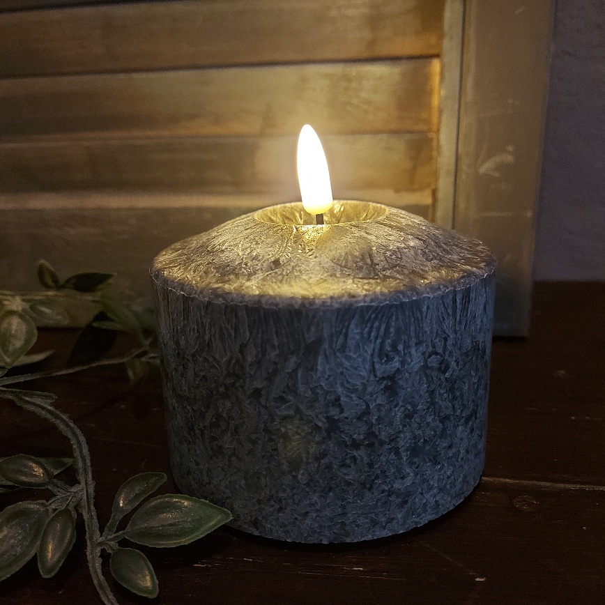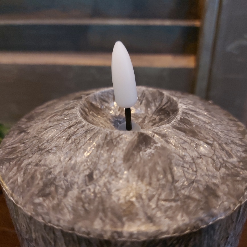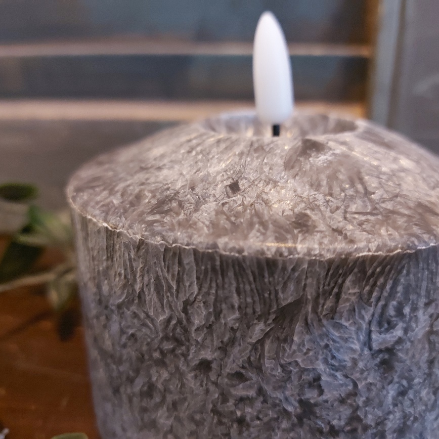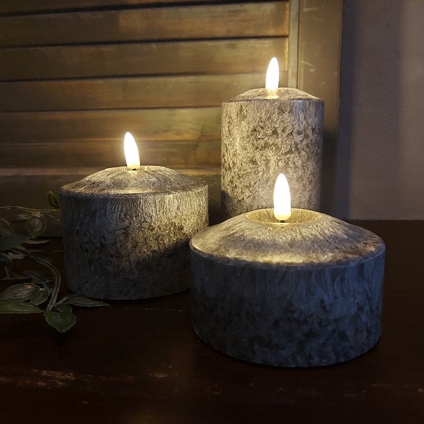 Nieuw in de collectie Led kaarsen van Mansion Atmosphere is deze zwart gemêleerde kleur. De kaars heeft een zwarte kleur en lijkt alsof hij van marmer is. Aan de bovenzijde zit een kuiltje waar de vlam in zit, zo lijkt het net of er al wat kaarsvet is weggesmolten. De buitenzijde van de Led stompkaars is gemaakt van kaarsvet.