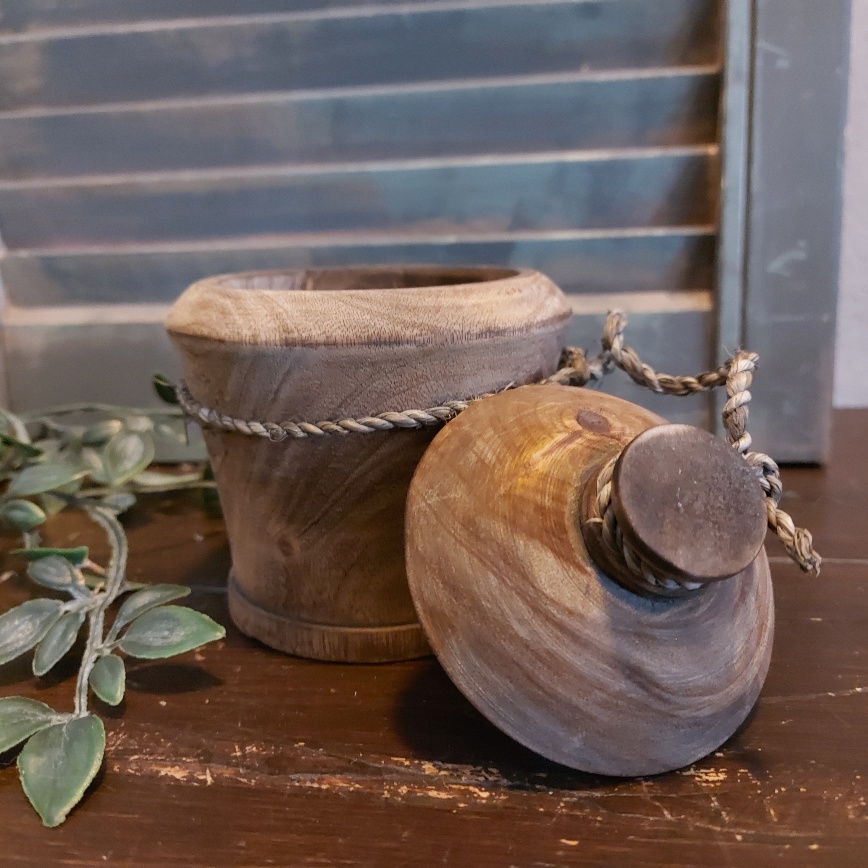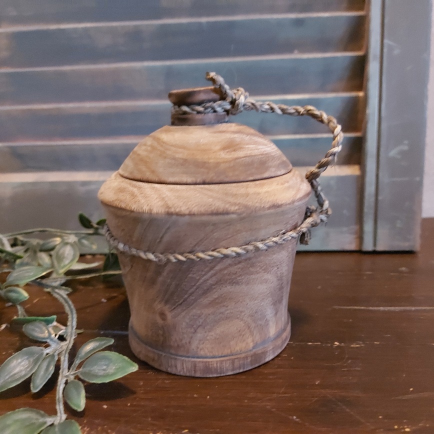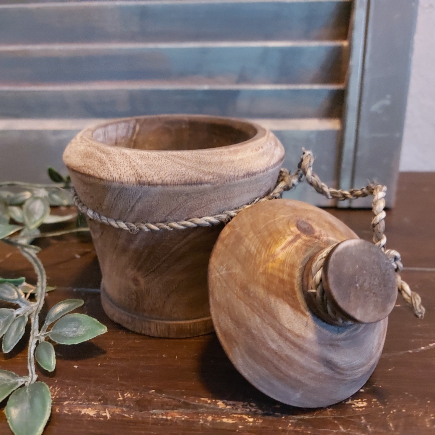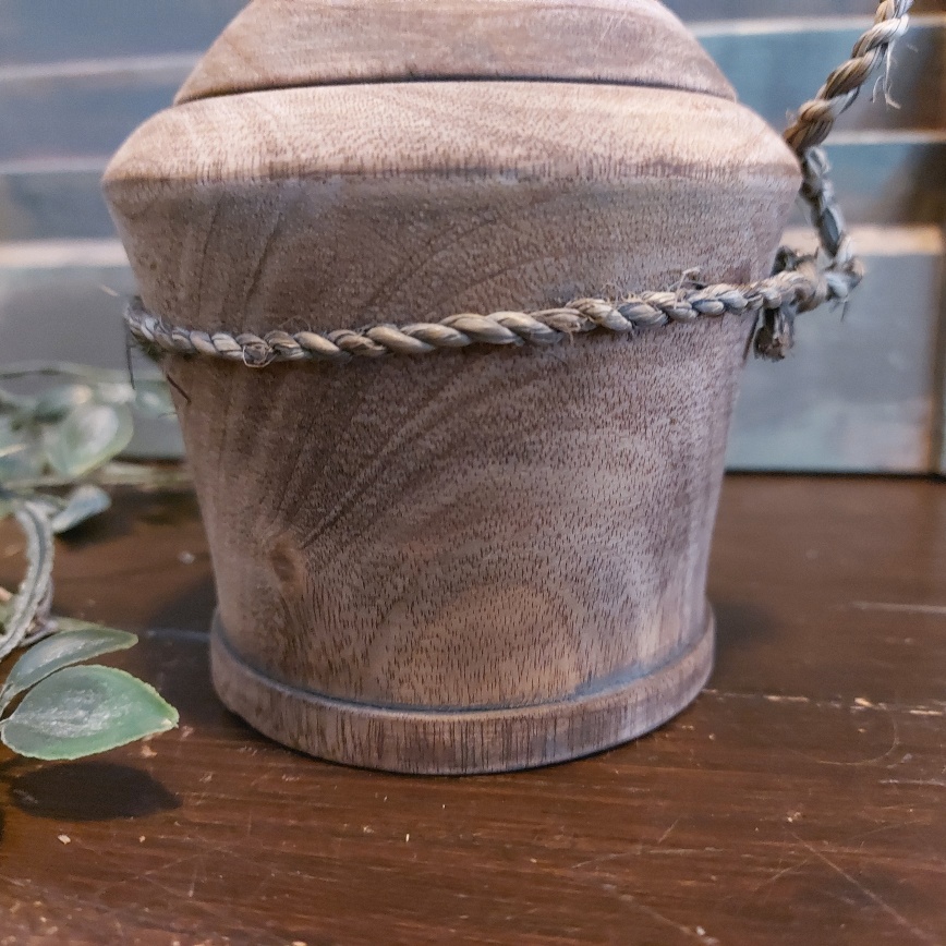 De houten pot met deksel is zo mooi van zichzelf dat hij eigenlijk helemaal geen vulling nodig heeft. Mocht je dit toch wel willen doen, kies dan voor een kunstbloem of plant, want de pot is niet te vullen met water.