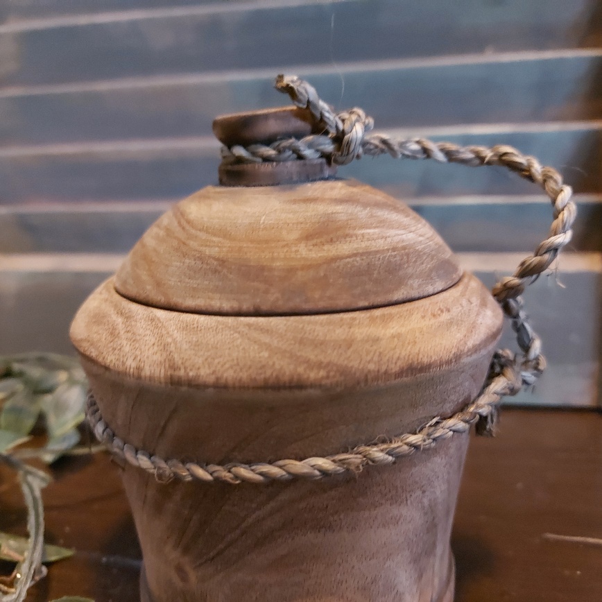 Deze Nepalese pot van hout heeft een warme donker bruine kleur. In het hout van deze pot komen de nerven en knoesten prachtig tot hun recht!ย Het deksel van de Nepalese pot is afneembaar en zit aan de pot vast met een sierlijk gedraaid koord.