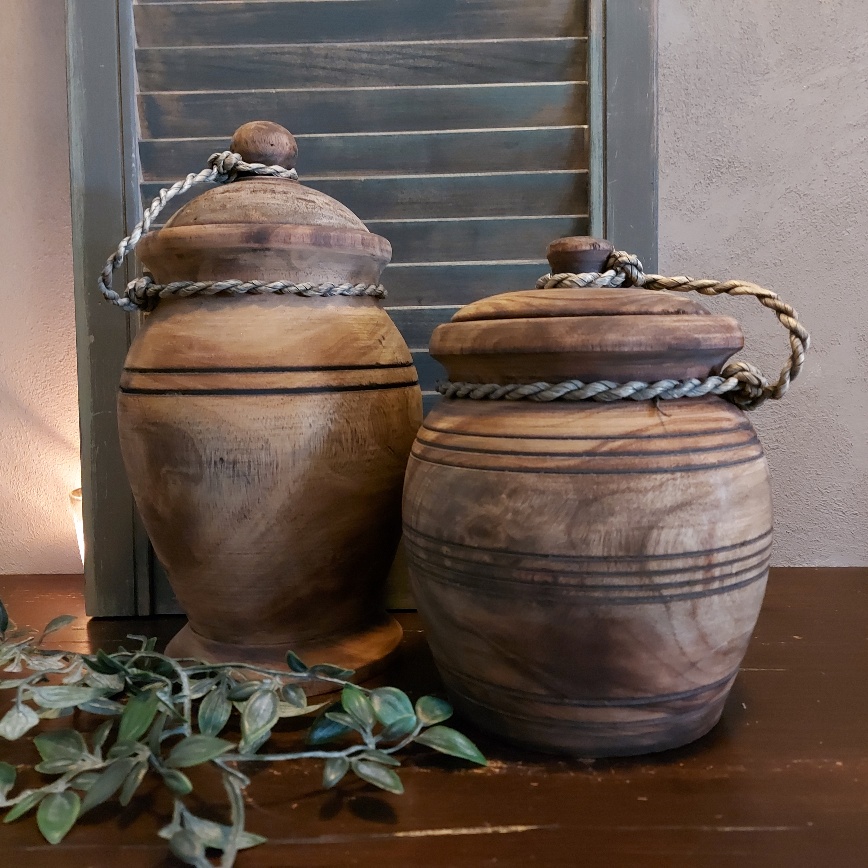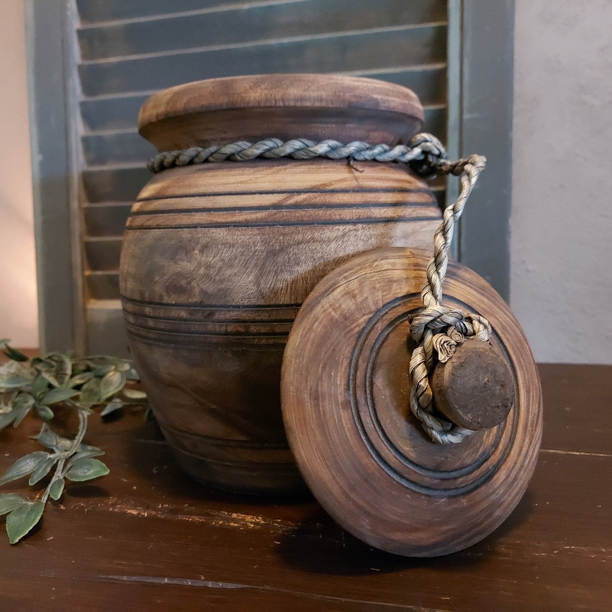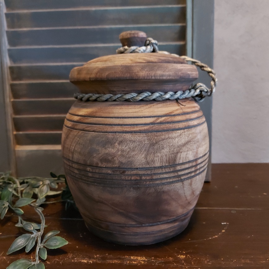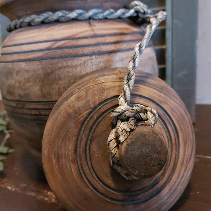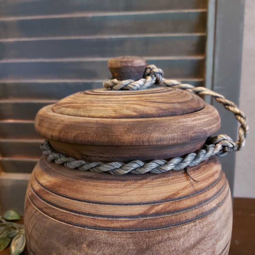 Het deksel van de Nepalese pot is afneembaar en zit aan de pot vast met een sierlijk gedraaid koord. De houten pot met deksel is zo mooi van zichzelf dat hij eigenlijk helemaal geen vulling nodig heeft. Mocht je dit toch wel willen doen, kies dan voor een kunstbloem of plant, want de pot is niet te vullen met water.