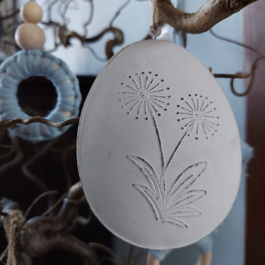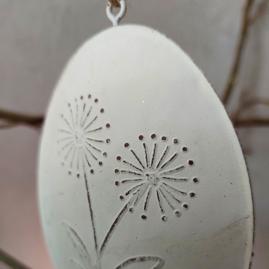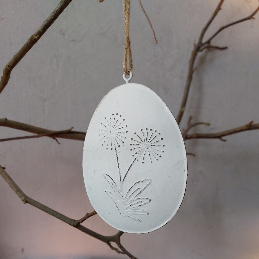Je Paastak landelijk aankleden? Dat heb je zo voor elkaar met deze mooi hanger in de vorm van een paasei. Het paasei is gemaakt van metaal. Deze decoratie voor Pasen is uitgevoerd in een witte kleur, en op รฉรฉn zijde is een bloem in reliรซf aangebracht. Of je nu een complete boom of een eenvoudige tak gaat decoreren, dit ei mag niet ontbreken. Je hangt het ornament eenvoudig op aan het jute touw