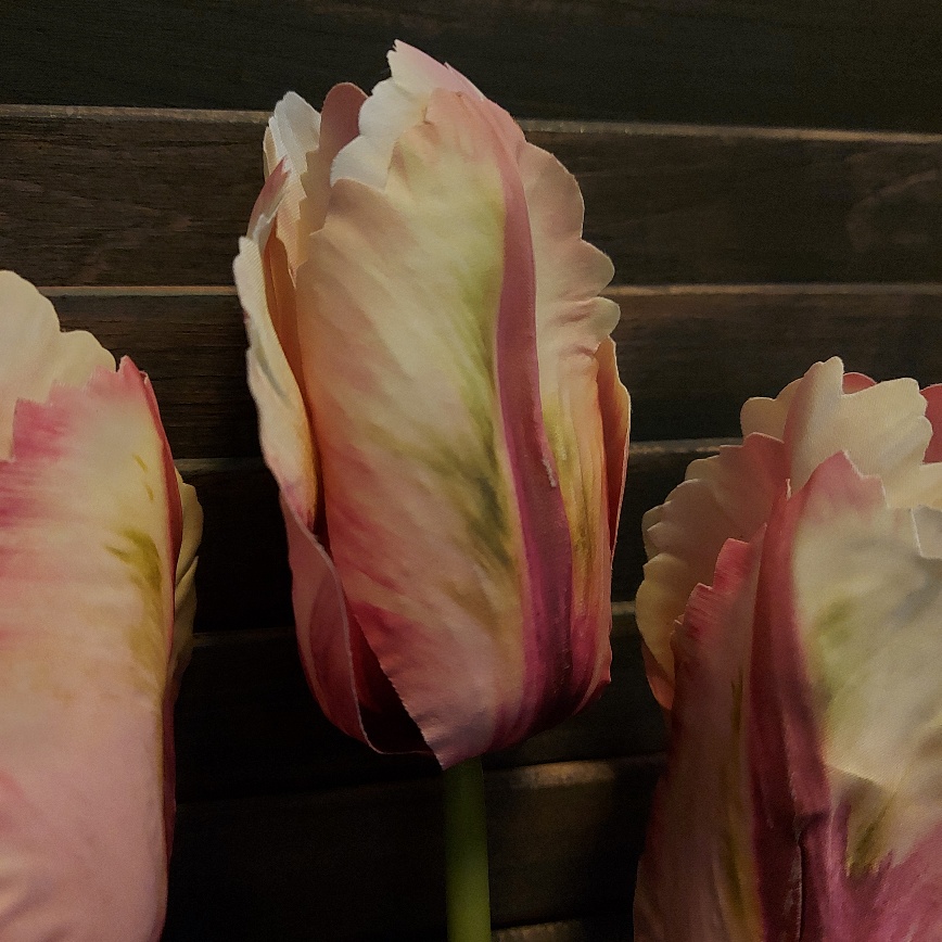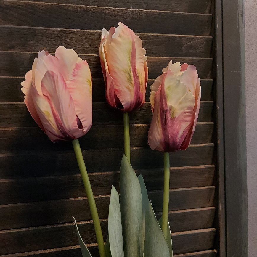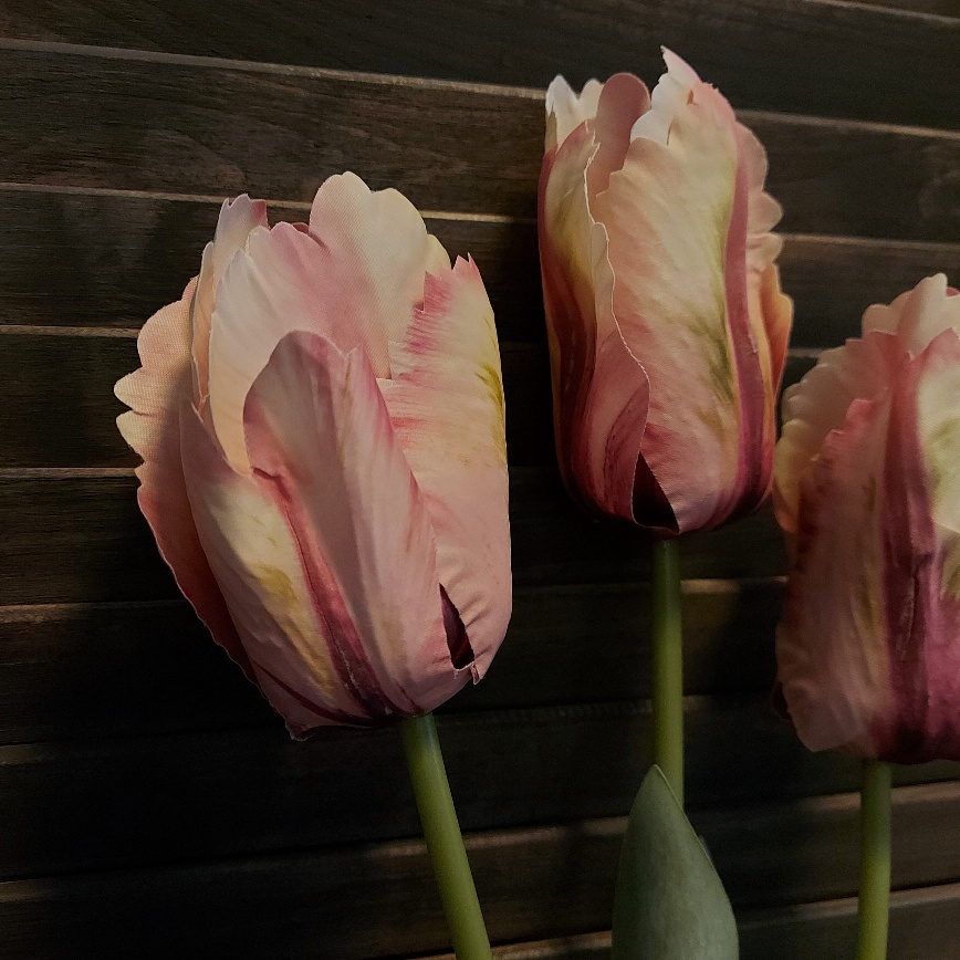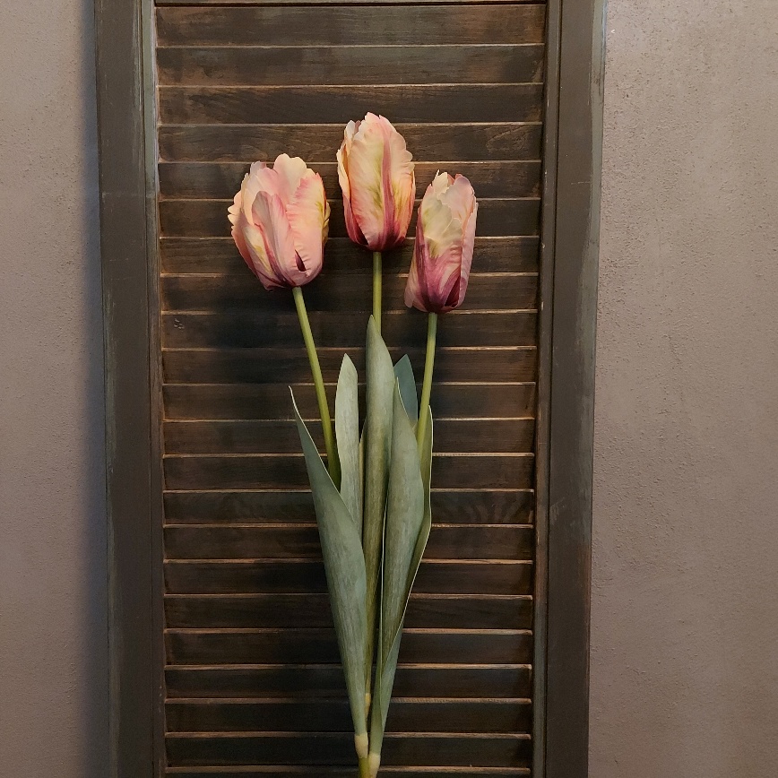 Door de lange steel is deze bos met drie roze papegaaitulpen van Countryfield heel geschikt om te gebruiken in een hoge vaas of fles. De kunsttulpen hebben een prachtig kleurenpalet wat varieert van bordeauxrood tot zacht roze. Elk bloemblad is anders om te zien en voorzien van een fijne structuur en een gekartelde rand. Elke steel is voorzien van groen blad en een tulp.