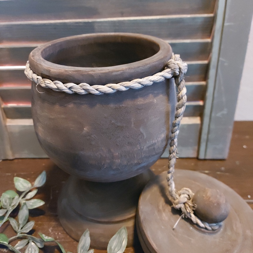 Het deksel van de Nepalese pot is afneembaar en zit aan de pot vast met een sierlijk gedraaid koord. De houten pot met deksel is zo mooi van zichzelf dat hij eigenlijk helemaal geen vulling nodig heeft. Mocht je dit toch wel willen doen, kies dan voor een kunstbloem of plant, want de pot is niet te vullen met water.