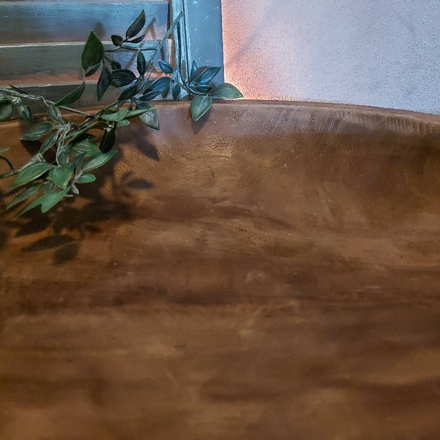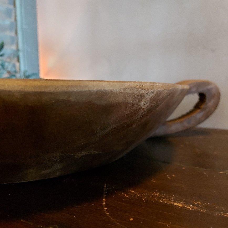Deze prachtige ronde schaal met handvat van mangohout is een echte blikvanger. Niet alleen door zijn omvang, maar ook door de prachtige kleur van het hout. Elke exemplaar van deze schaal heeft zijn eigen unieke patroon en nervenstructuur. Het hout is onbehandeld.