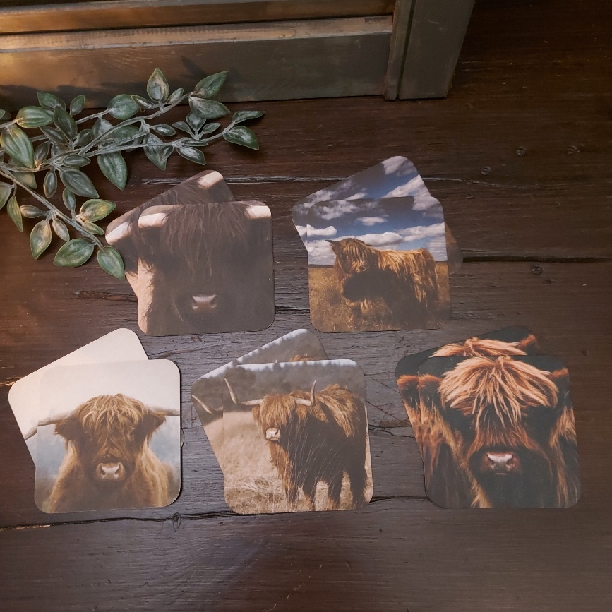 Deze set landelijke onderzetters bevat tien afbeeldingen van Schotse Hooglanders.