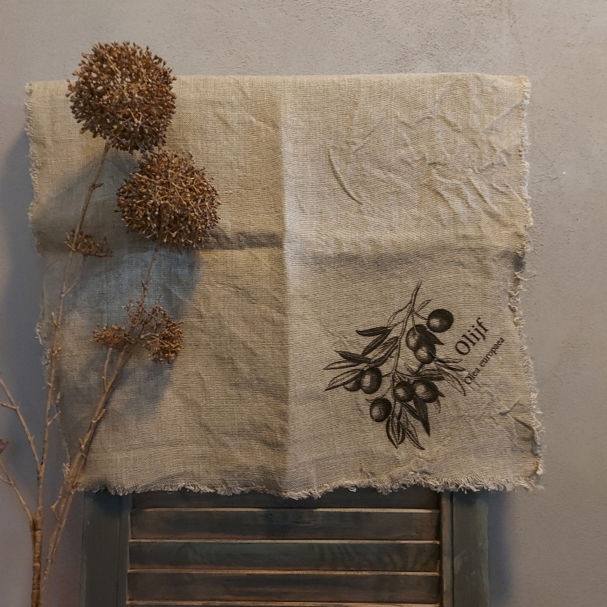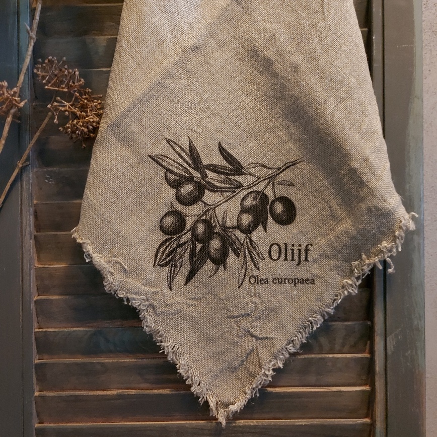 Op dit prachtige shabby doek staat een olijftak afgebeeld. De afbeelding is op het linnen doek gedrukt. Het linnen kleed heeft een afmeting van 45 x 45 cm. De shabby doeken hebben een mooie doorleefde uitstralingen en zijn niet voorzien van een zoom. Dit zorgt voor een mooi rafelig effect. De doeken zijn gemaakt van 100% grof shabby naturel kleurig linnen. De olijftak op het shabby doek is in sobere tinten afgebeeld. Dit zorgt voor een perfecte combinatie met het linnen.
