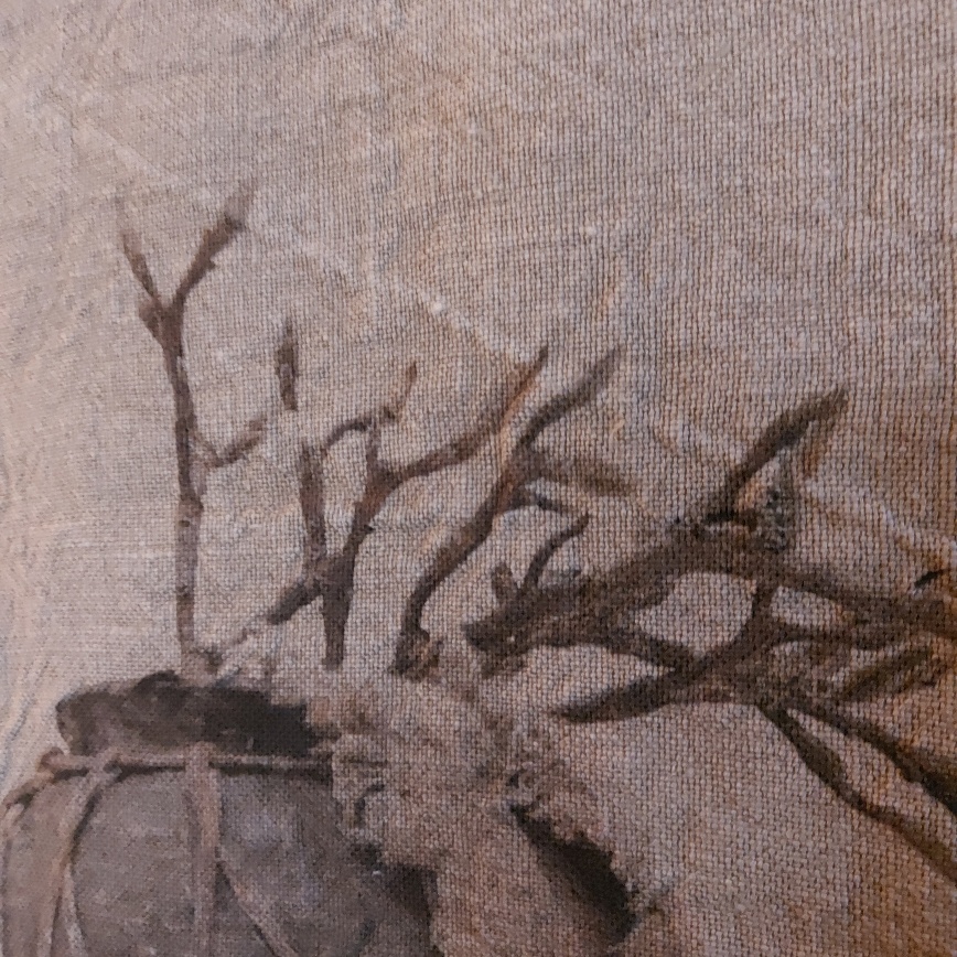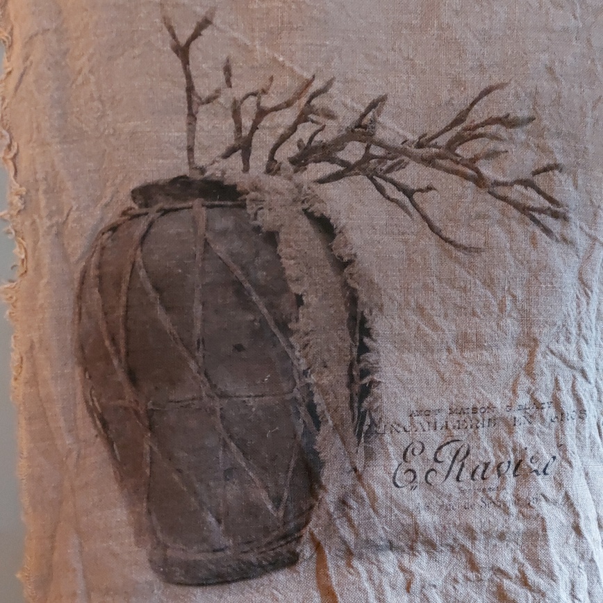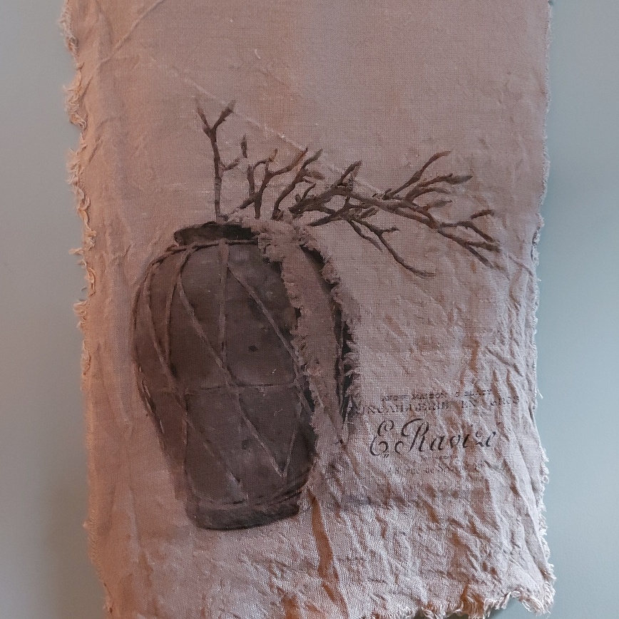 Op dit prachtige wanddoek staat een stilleven van een pot met takken afgebeeld. De afbeelding van het stilleven is op het shabby wandkleed gedrukt in sepia tinten. Het Stilleven Shabby wanddoek heeft een mooie doorleefde uitstralingen en is niet voorzien van een zoom. Dit zorgt voor een mooi rafelig effect. De doeken zijn gemaakt van 100% grof shabby naturel kleurig linnen.
