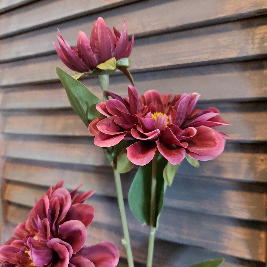 De bordeauxrode Sylxz Zinnia zijdenbloem heeft drie bloemen aan de steel zitten. Deze Zinnia is uitgevoerd in ‘Real Touch’ dat betekent dat de bloem en het blad ook voelt als een echte Zinnia bloem. De steel is voorzien van twee grote bloeiende bloemen en een bloem die net uit knop komt.