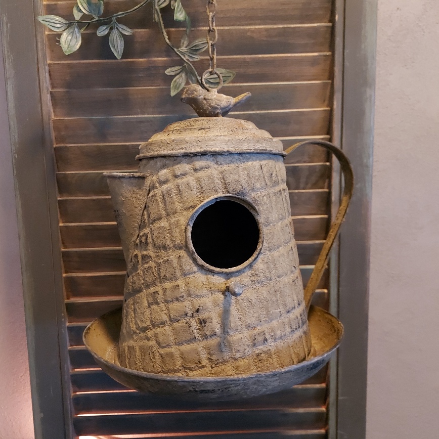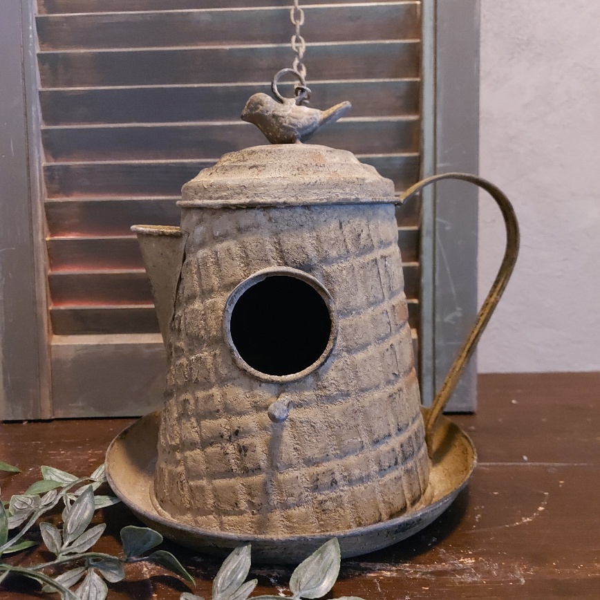 Hoe grappig is het model van dit vogelhuis, een koffiepot. Het vogelhuis is gemaakt van metaal en heeft een geroeste vintage uitstraling. Het huisje is zowel te gebruiken als voederschaal. Je kan strooivoer in de rand van de schaal leggen. Maar vogeltjes hebben ook de mogelijkheid om een nestje te bouwen in de koffiepot.