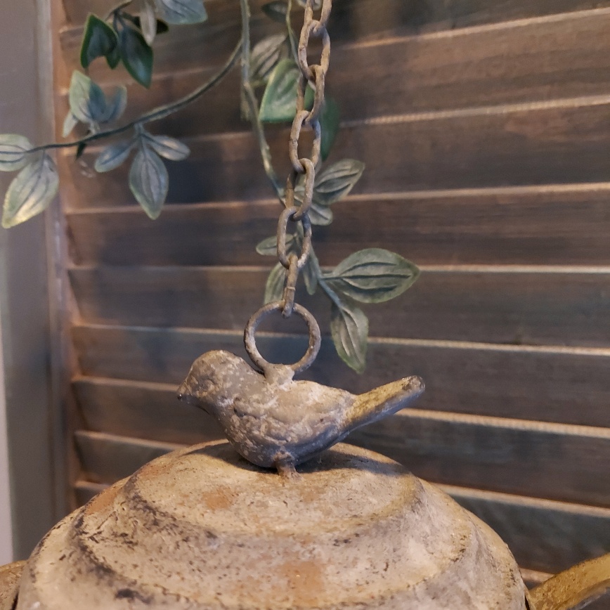 Het vogelhuisje is voorzien van een ketting en een ring. Je kan hem dus gelijk ophangen.